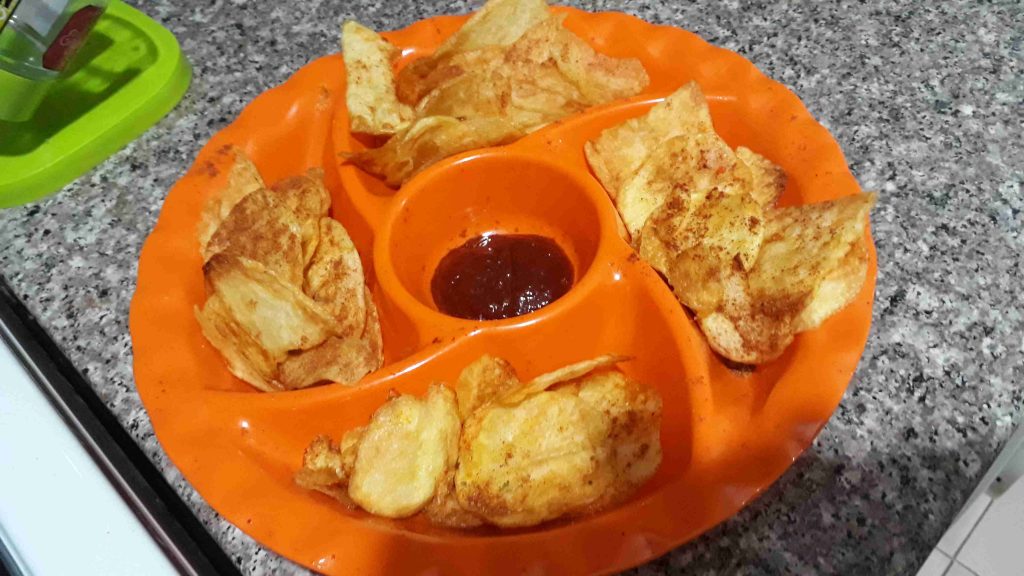 تقطع البطاطا بالمبرشة بحيث تكون رقيقة ثم تنقع بالماء والملح والخل لمدة لا تقل عن ساعتين ثم تصفى من الماء وتنشف جيدا بفوطة نظيفة وتقلى بماء غزير وعند إخراجها من الزيت لا تقومي بوضع فاين التنشيف تحت الشبس لانه بطرى وصحة وهنا على قلب الجميع