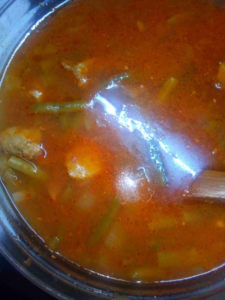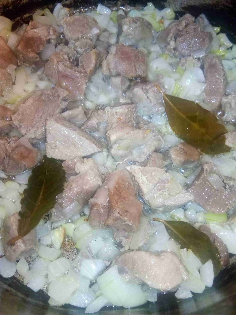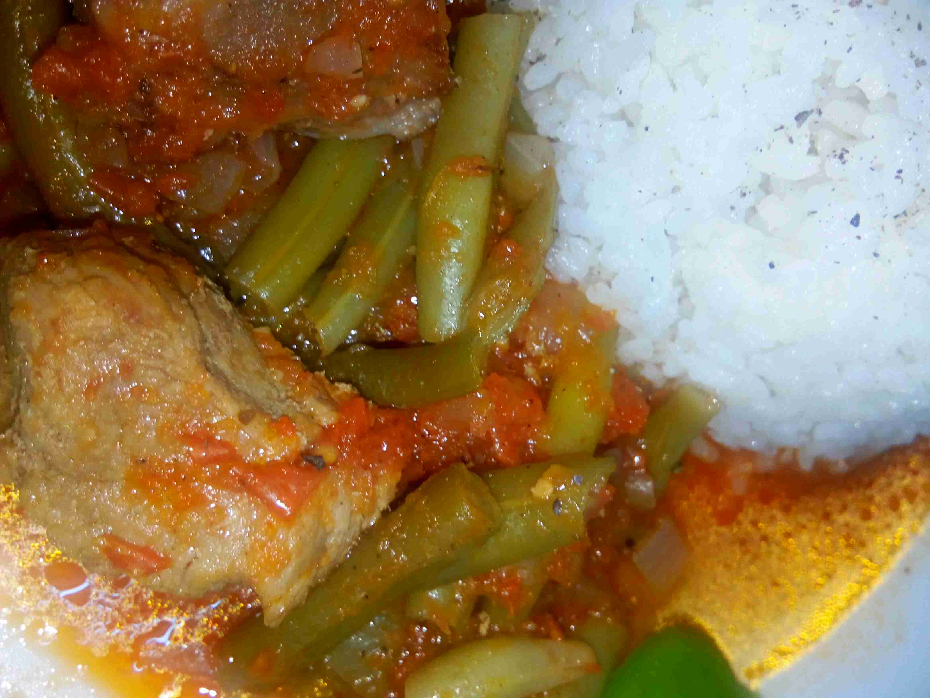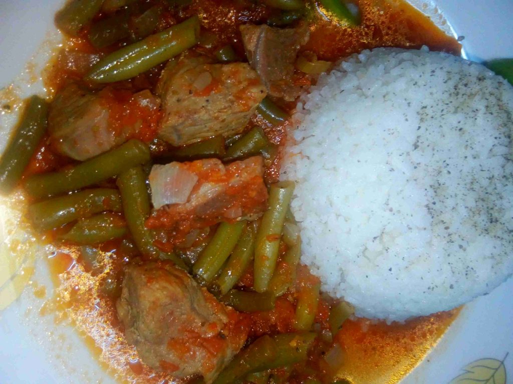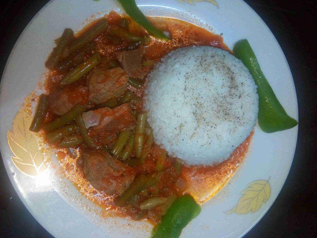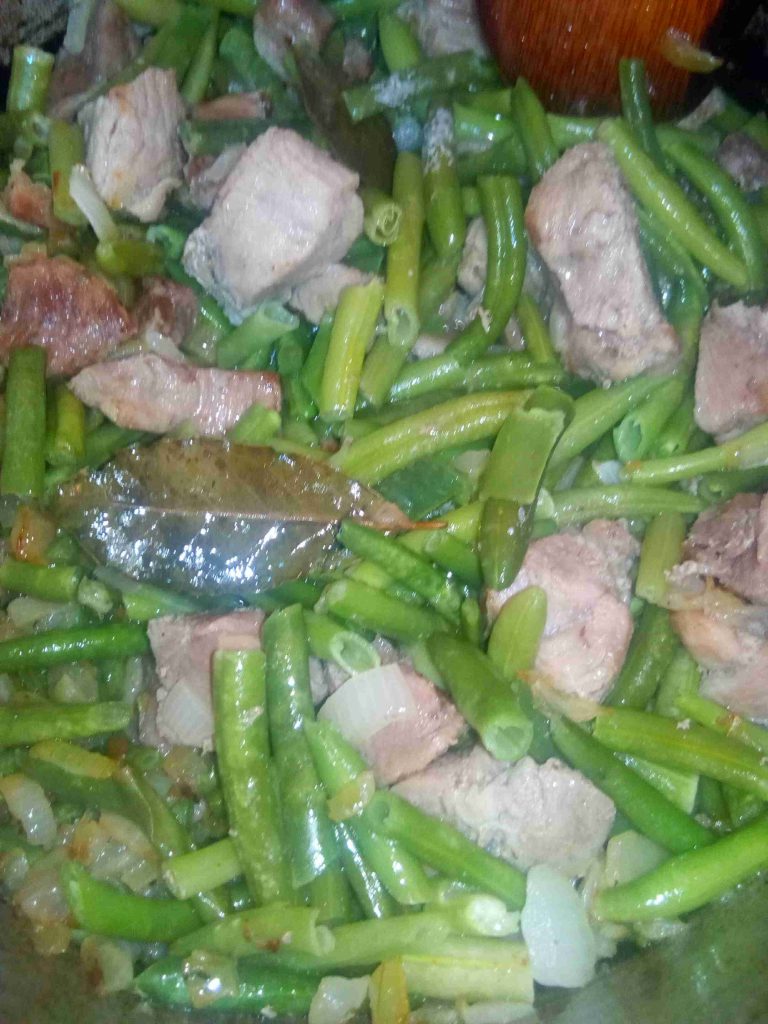 بعدين بقطع الفاصوليا وبغسلها وبصفي اللحمة من مرقتها وبفرم البصل وبقليه معها بعدين بضيف الفاصوليا وبعد ما يتغير لونها وتستوي شوي بضيف البندورة المهروسة وبعد ما تغلي بزيد مرقة ومية البندورة وملح وفلفل وبطفي تحتها بعد ما تتسبك منيح وتستوي