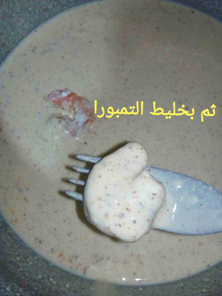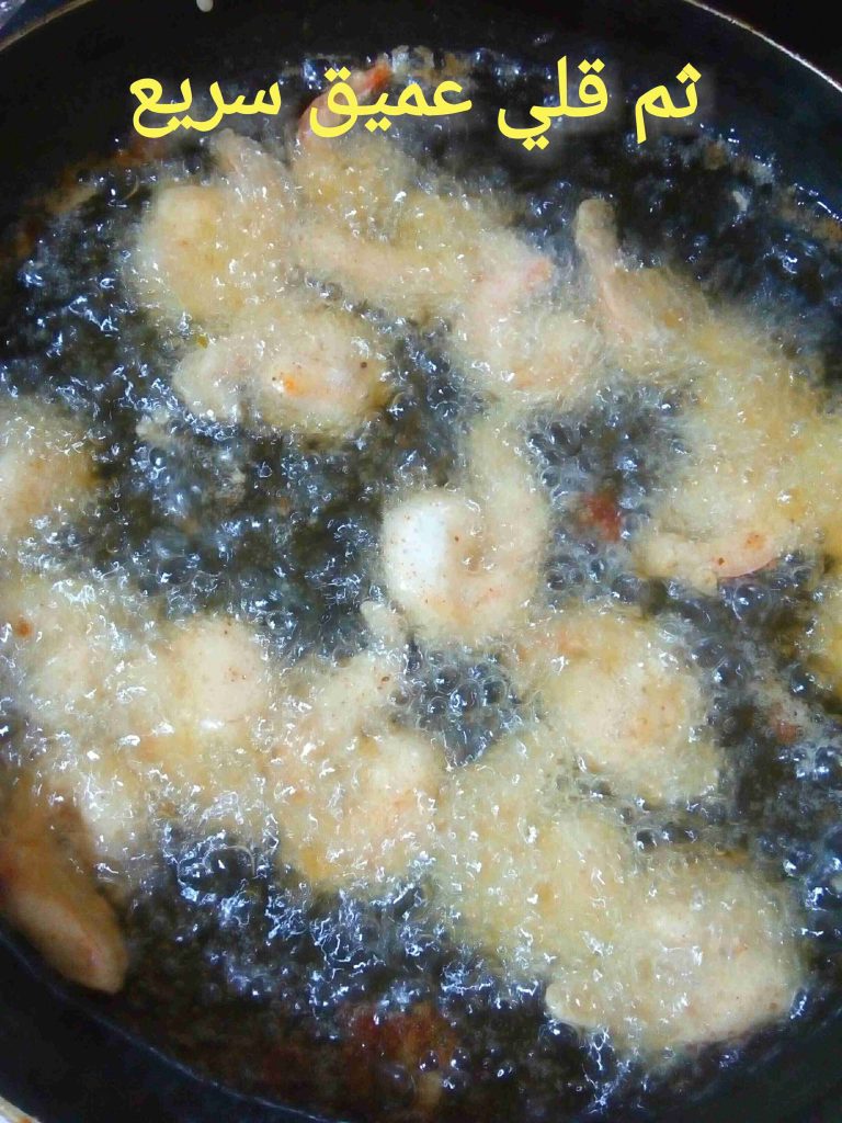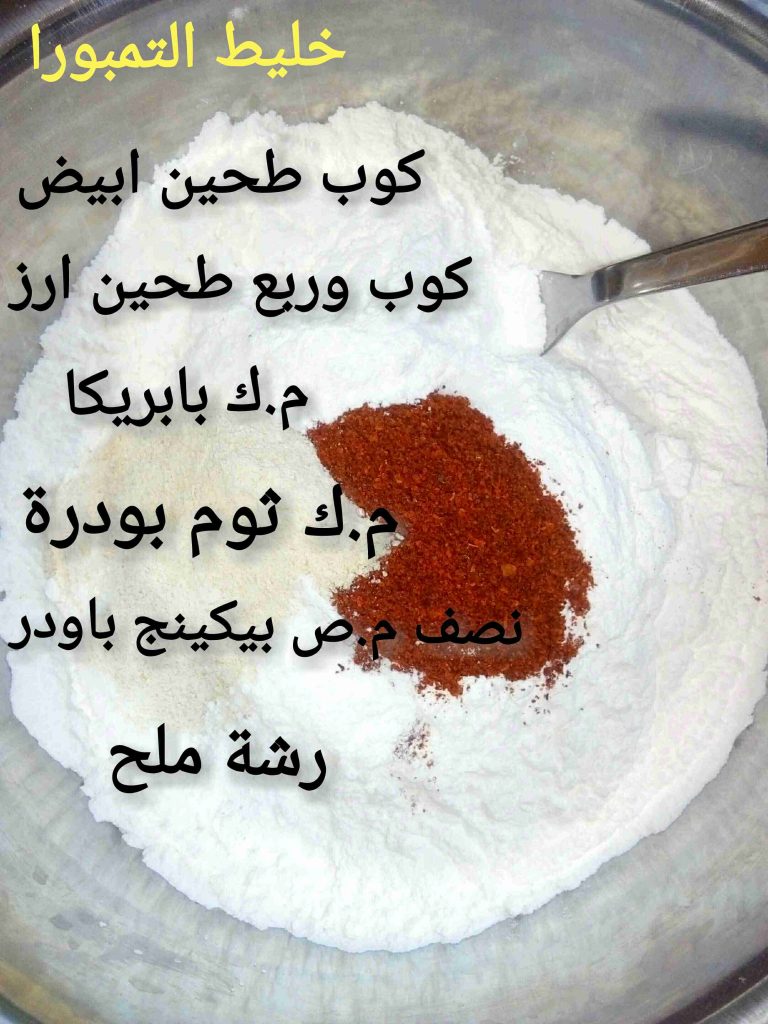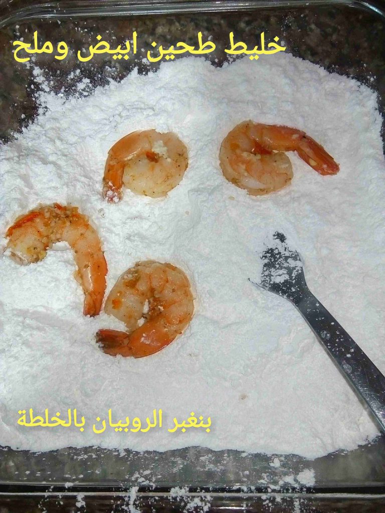 بنكون مجهزين طبقين واحد طحين وملح وواحد خليط التمبورا وبنصير نغبر حبات الروبيان بالطحين ونلتّها بالتمبورا وعالزيت الساخن فورا وما نكثر بالقلاية خلي السمك مرتاح.