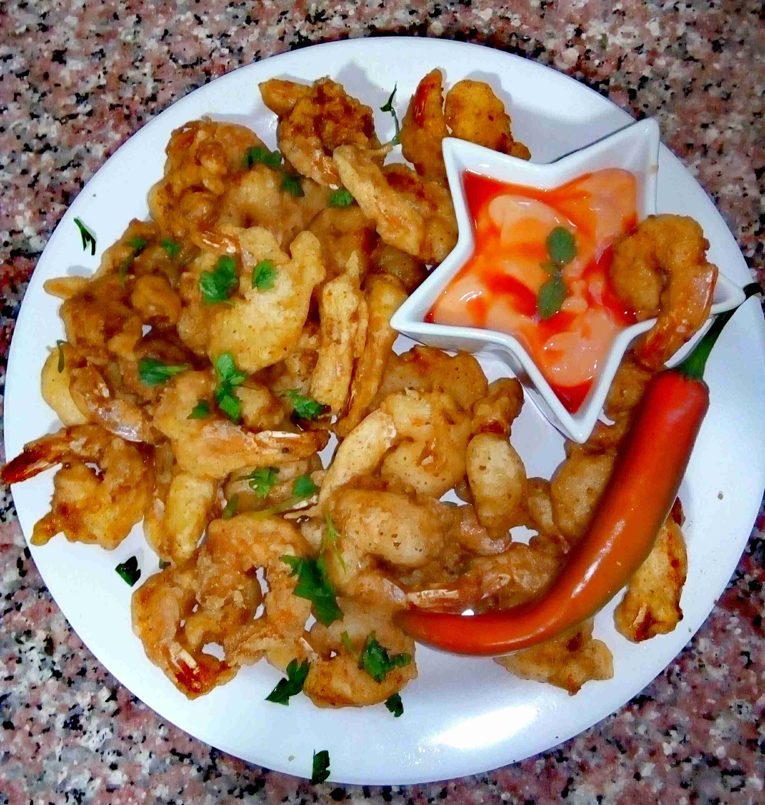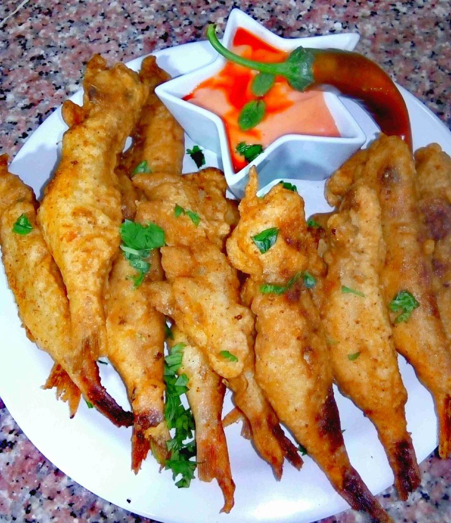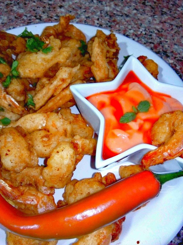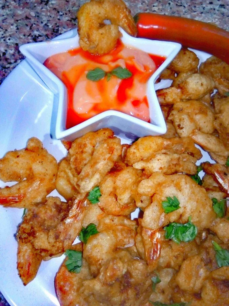 بنكون مجهزين طبقين واحد طحين وملح وواحد خليط التمبورا وبنصير نغبر حبات الروبيان بالطحين ونلتّها بالتمبورا وعالزيت الساخن فورا وما نكثر بالقلاية خلي السمك مرتاح.