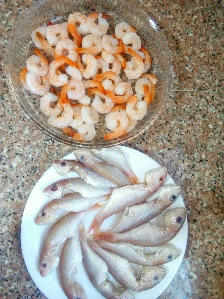 استخدمت الروبيان وسمك السلطان ابراهيم حجم صغير نظفته مضبوط وتبلته بتتبيلة السمك يلي نزلتها المرة الماضيه موجودة بملفي.
