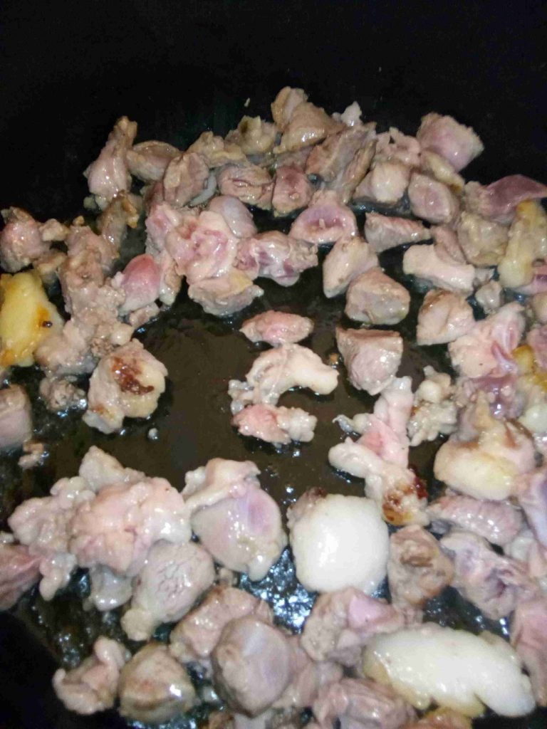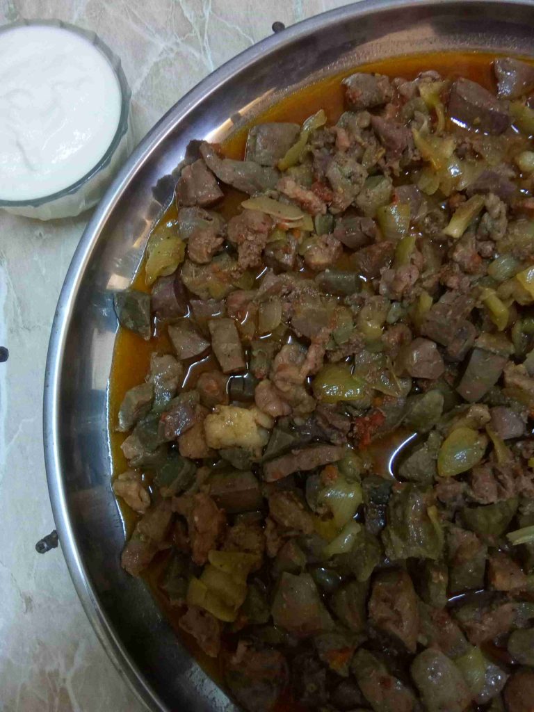 بعدين بحط اللحمة وبقلبها مع اللية بعدين بحط المعلاق وكبدة العجل كله مع بعض منشان تطعم على بعضها بعد ما يتغير لونهم بضيف البصل وبقشر البندورات وبفرهم وبضيفهم عليهم وبغطي عليهم ليستوا بحط ملح وفلفل وبقدمه مع لبن رايب