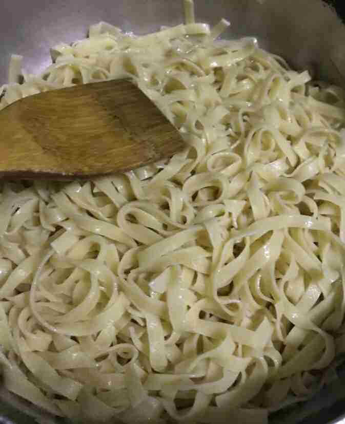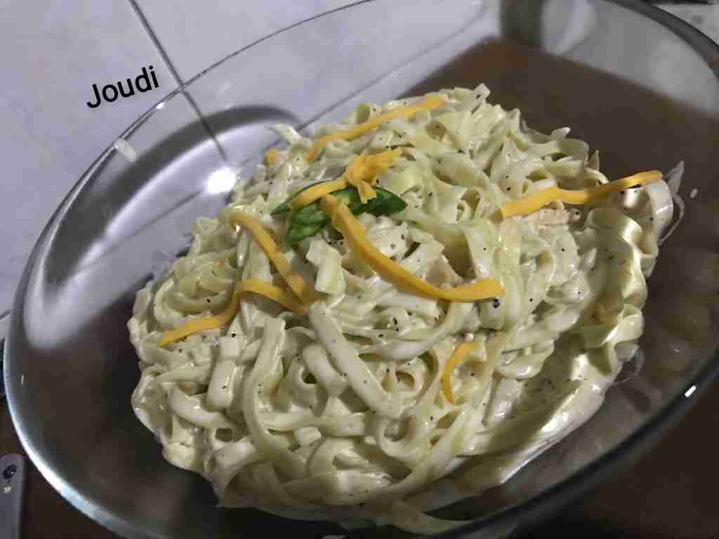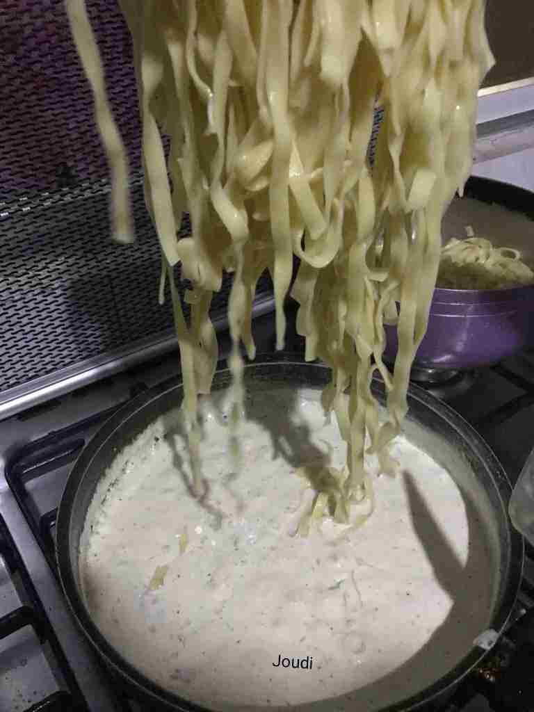 بأثناء طبخ المكونات بنكون شغلنا النار تحت المي لسلق المعكرونة مع رشه ملح وملعقه زيت بس تغلي بنضيف المعكرونة حوالي ٤ل٥ دقائق برفعها من المي وبنضيفها للطبخة وبنحرك حتى تمتزج كل المكونات مع بعض وبنضبط الملح وبنسكبو بصحن التقديم وبنرش ع وجهو الجبنة يلي بنحبها وهي سخنه عشان يسيحو وبنزينو بالبقدونس او ورق نعنع وصحة وهنا