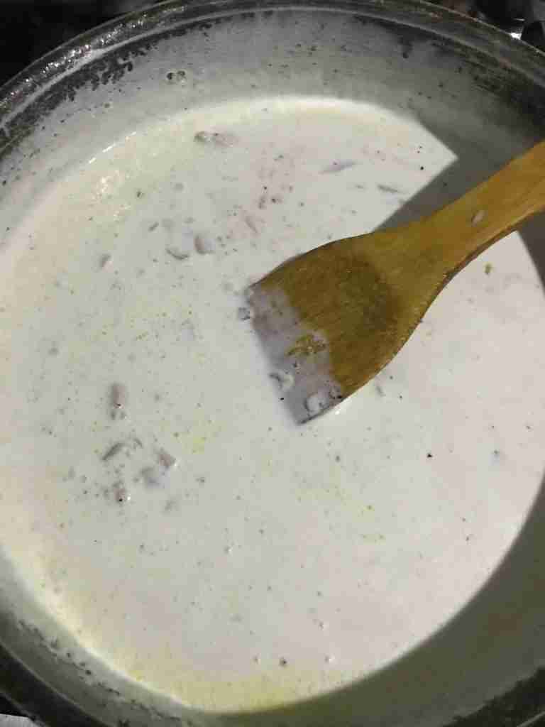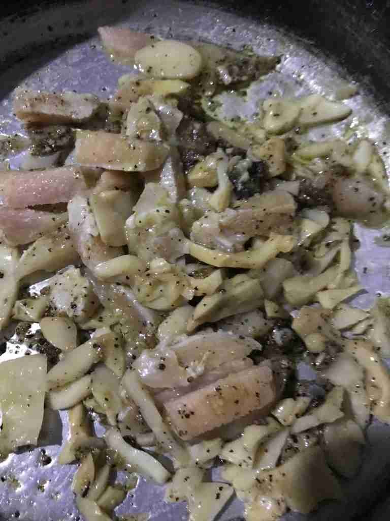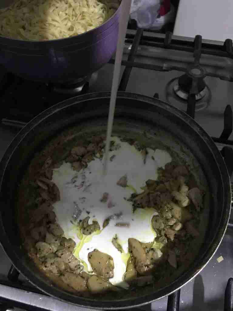 بسم الله بنبلش اول شي بنقطع الدجاج لمكعبات وبنتركو بوعاء وبنضيف لو فلفل وخل نص ساعة قبل ما نبلش بالطبخة وبعدها بنقطع بصلة صغيره و٤حبات ثوم كمان بنقطعو ناعم وبنقليهم بالزيت مع ملح وفلفل ولما يذبلو بنضيف مكعب المرق بعدها بنضيف الدجاج المقطع وبنحرك كويس حتى نتأكد من استوائو يعني وبس نلاحظ انو قرب يستوي بنضيف الفطر حتى يكملو استواء مع بعض وبعد ما تأكدنا من استواء الفطر والدجاج بنضيف كريمه طبخ مع استمر التحريك حتى يغلو مع بعض
