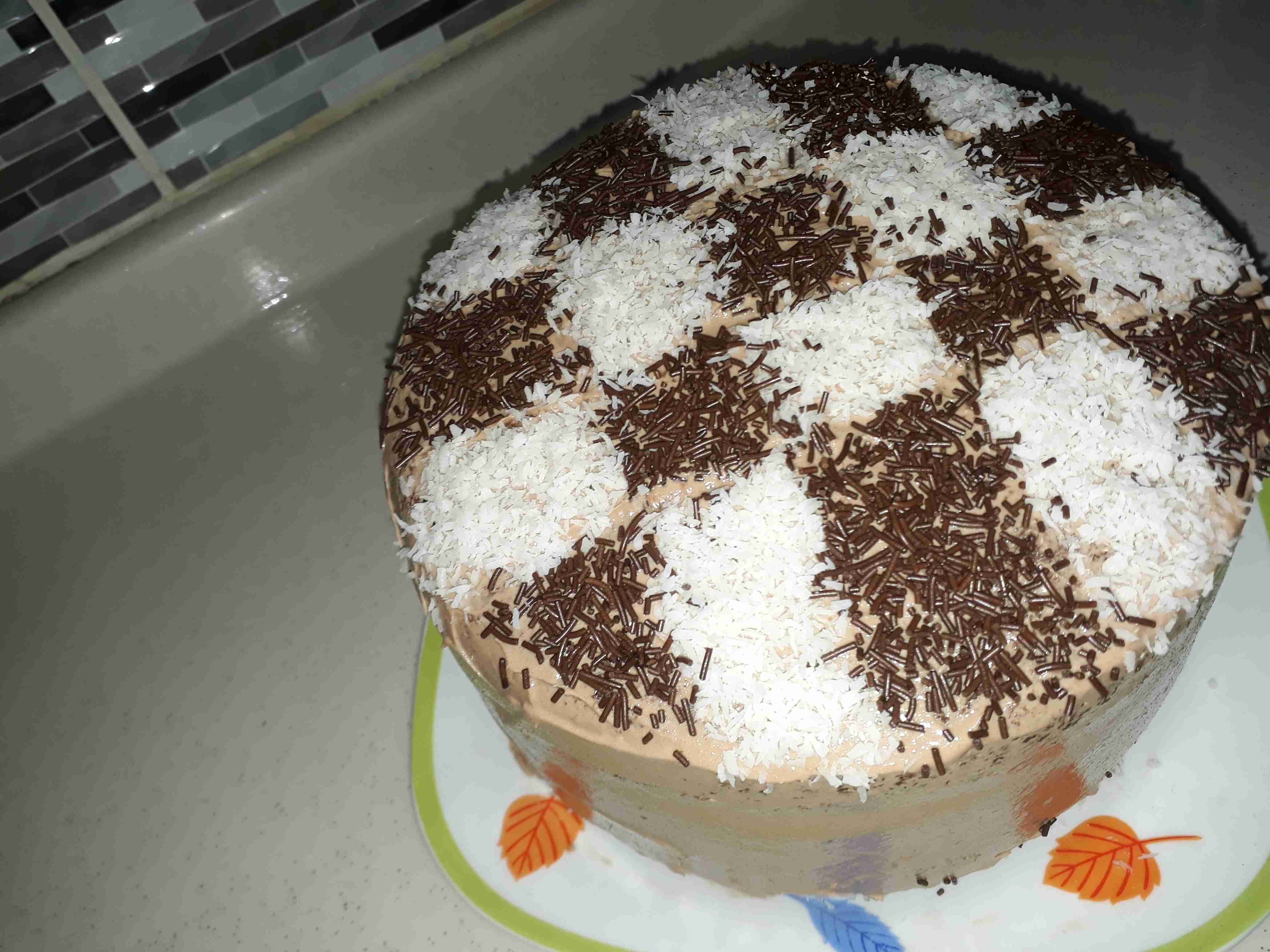 جبت كرتونة و رسمت عليها مربعات و بلشت اترك مربع و افرغ مربع و ازينو بالفارمسلي و جوز الهند و هيك لخلصت كل الكيكة~