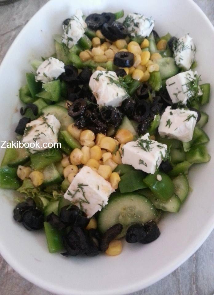 خيار ذرة خس او ملفوف فلفل زيتون اسود مقطع جبن فيتا مع شوية شبت الصوص فنجان زيت فنجان خل اوريغانو ملح