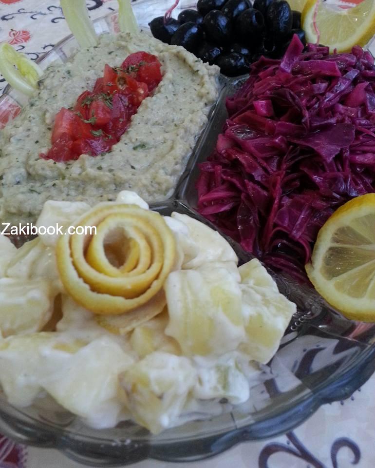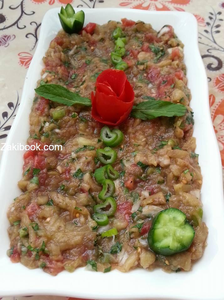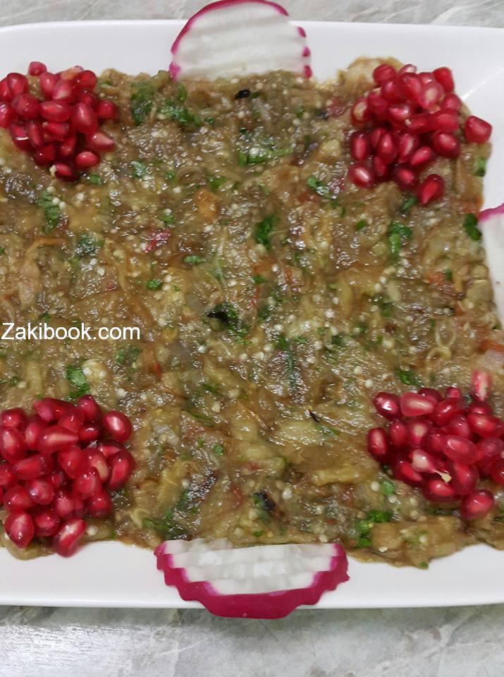 باذنجان مشوي ومهروس بصل وبندورة مشوية بنخلطو مع بعض وبنضيفلو فص توم مهروس وملح ودبس رمان وبقدونس مفروم
