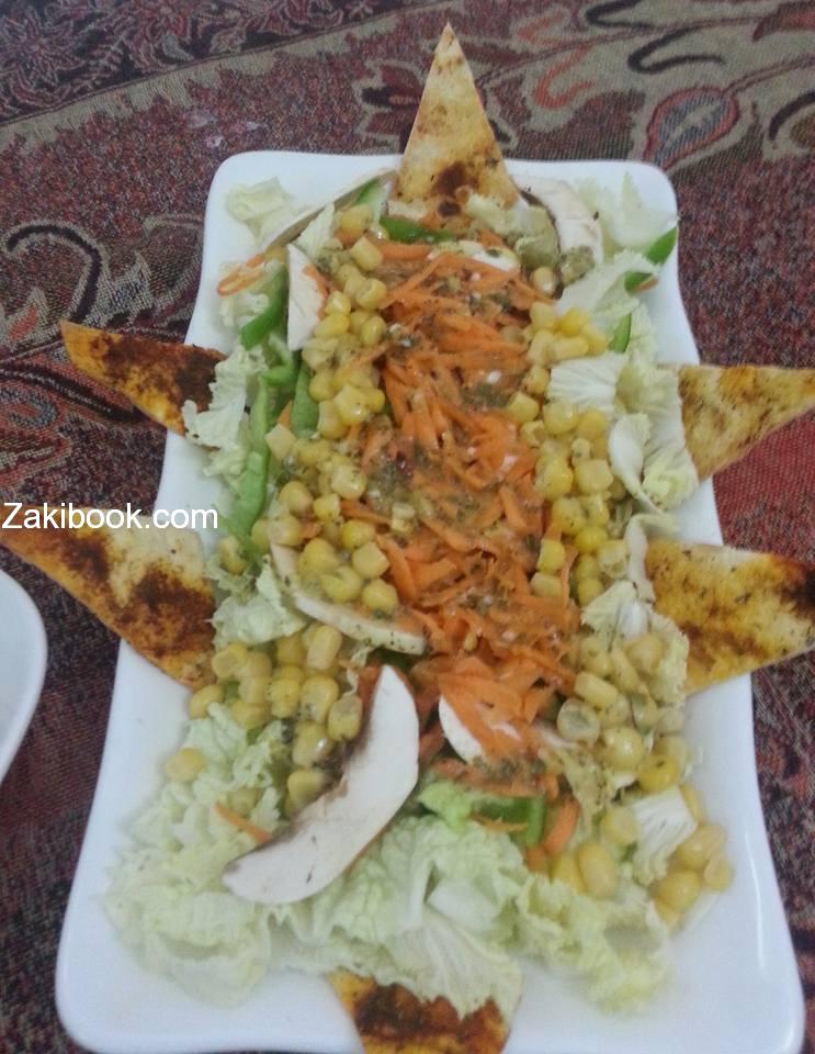 خس افرنجي فلفل ذرة.جزر مبشور فطر فريش شرايح رقيقة…تتبيلة السلطة الجاهز وبنزينها بتورتيلا مشوية بالفرن مع شوية زيت ورشة اوريغانو وبابريكا