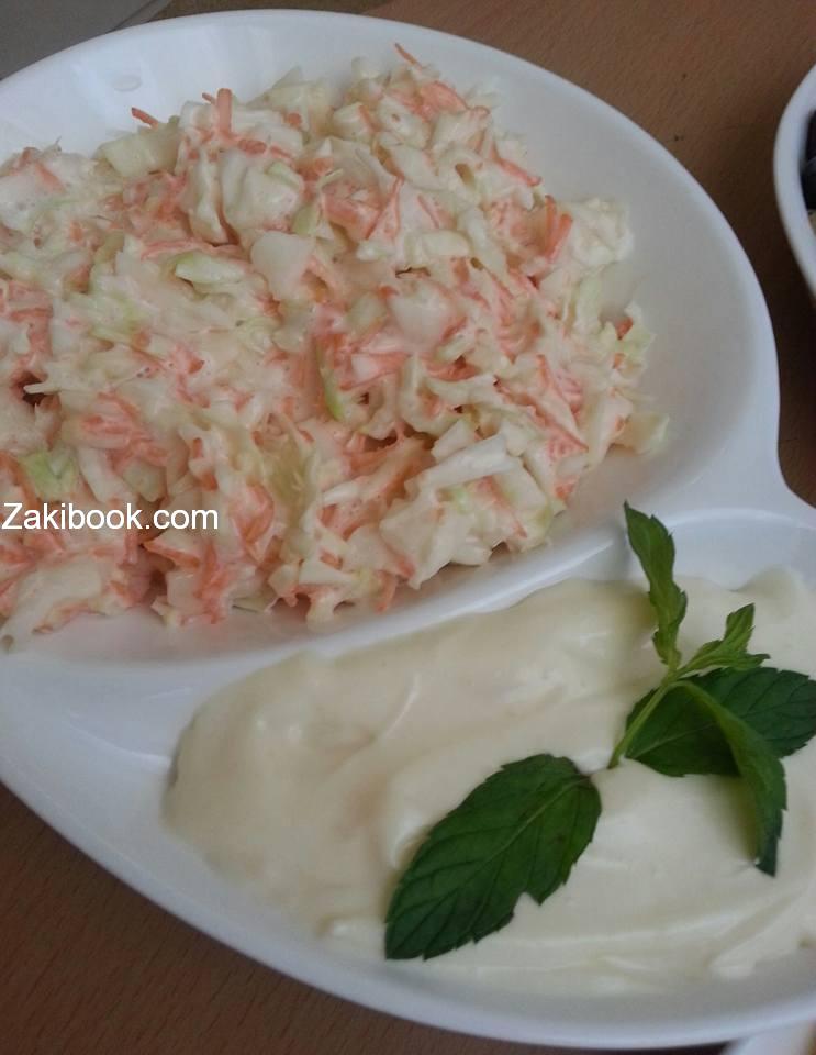 الكولسلو شرايح ملفوف رقيقة جدا جزر مبشور مايونيز مخفف بكريمة او حليب سكر مطحون ملعقة خل رشة صغيرة ملح رشة صغيرة فلفل ابيض
