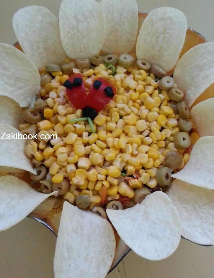 خس مفروم جزر مبشور زيتون فلفل مقطع الصوص لبن ومايونيز وملح وليمون وبنزينها بالذرة والليمون وشيبس برنگلز عشكل دوار الشمس