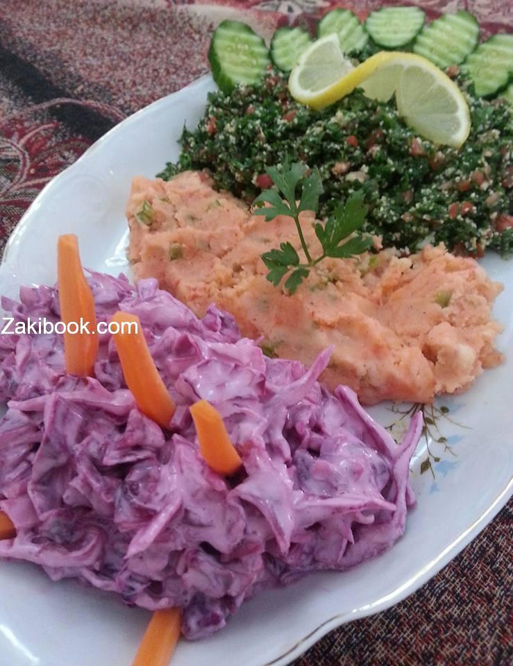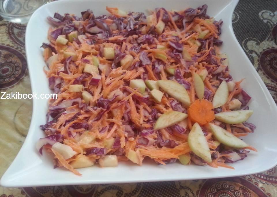 سلطة المفلوف ملفوف احمر شرايح منقوع بخل وملعقة سكر وملعقة ملح شي نص ساعة وبنضيفلو لبن ومايونيز عيار اللبن اكثر من المايونيز