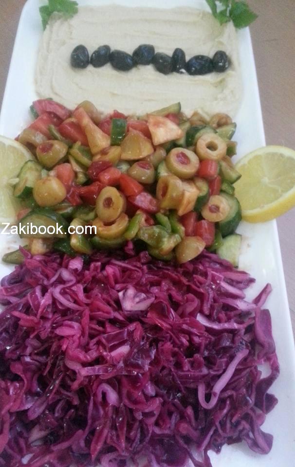 ملفوف احمر شرايح رقيقة منقوع بفنجان خل وملعقة سكر وملعقة ملح بنترو نص ساعة وبنضيفلو زيت زيتون وفلفل اسود.