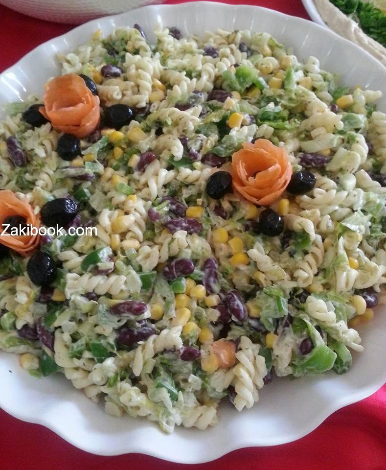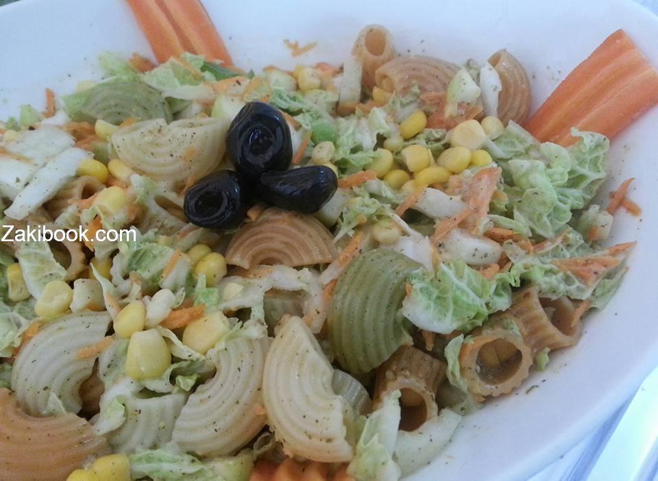 معكرونة مسلوقة خس مفروم فلفل جزر مبشور ذرة فاصوليا حمرا مصفاية ومغسولة…كوب لبن 3ملاعق مايونيز ملعقة خردل ملح فلفل اسود رشة صغيرة