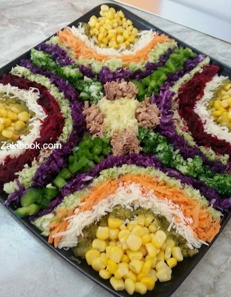 حسب الترتيب…ذرة مخلل جبن جزر ملفوف احمر وابيض شوندر مسلوق ومبشور بروكلي مسلوق ومفتت فلفل وبالنص بطاطا مهروسة وعالجوانب تونة مفتتة وشو مابدكم حطو خضار الصوص بالخلاط,فنجان زيت فنجان خل ملعقة خردل ملح اوريغانو (يعني زعتر بري) فلفل