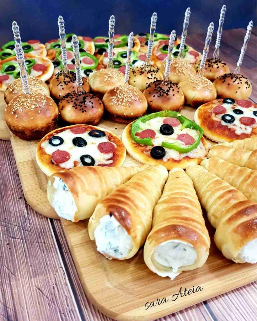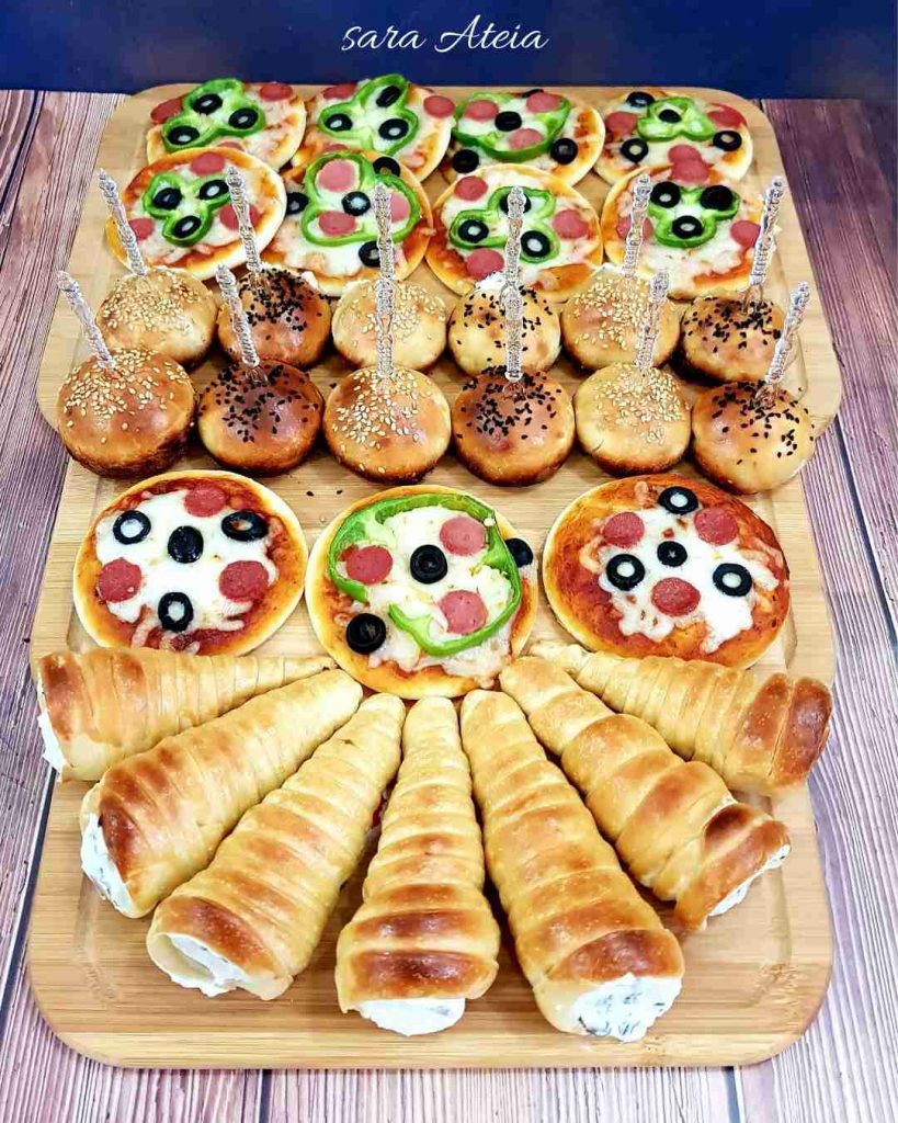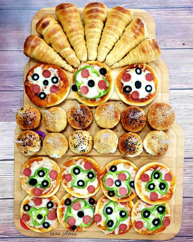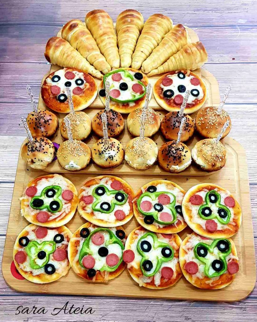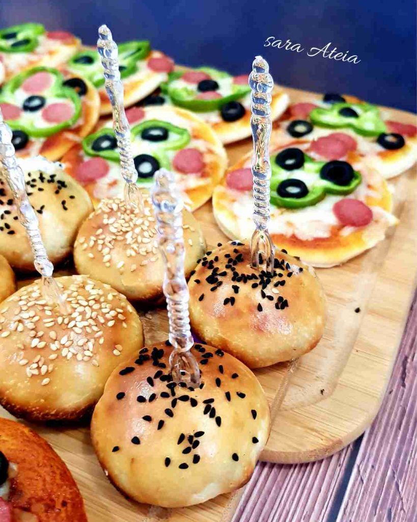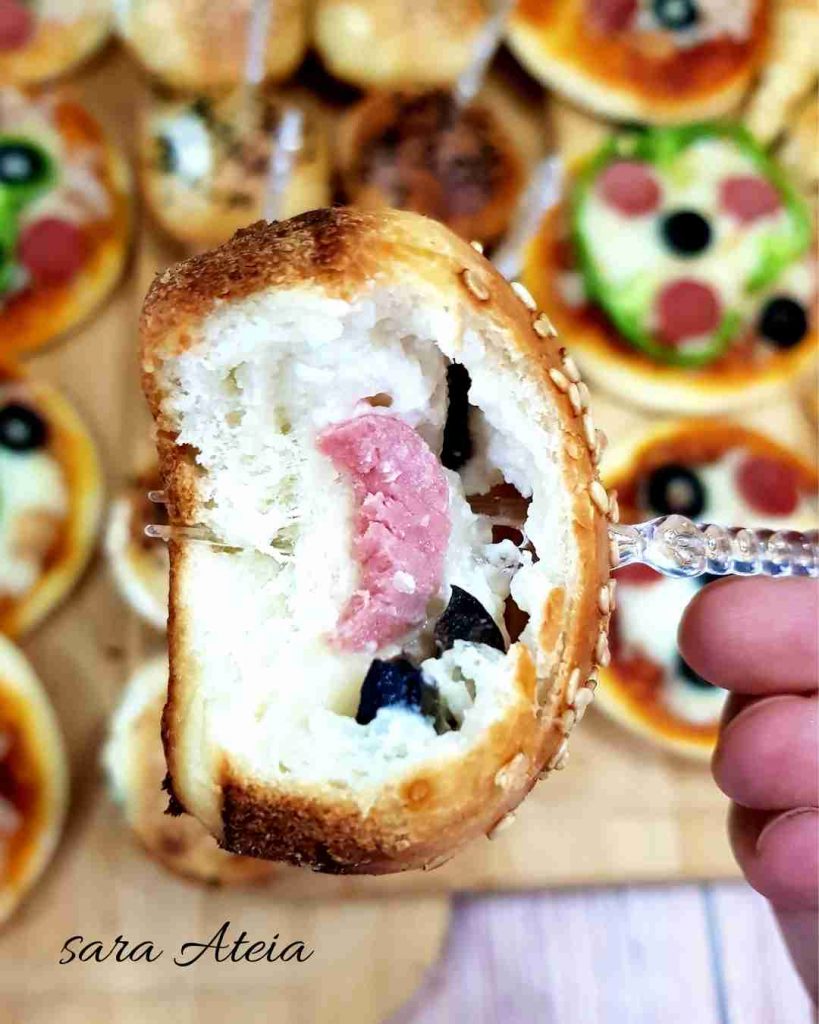 نضع الخميره ومعلقه من السكر فى نص كوب ماء دافئ ونقلبها جيدا ونتركها تتخمر نخلط المواد الجافه معا ثم نضيف لها المواد السائله والخميره ونعجنها جيدا حتى تكون العجينه ناعمه وبتلزق قليلا نتركها تخمر حتى يتضاعف حجمها ونبدأ فى تشكيل الفطاير فيديو الوصفه بالتفصيل على قناتى باليوتيوب مطبخ ساره عطيه sara Ateia kitchen