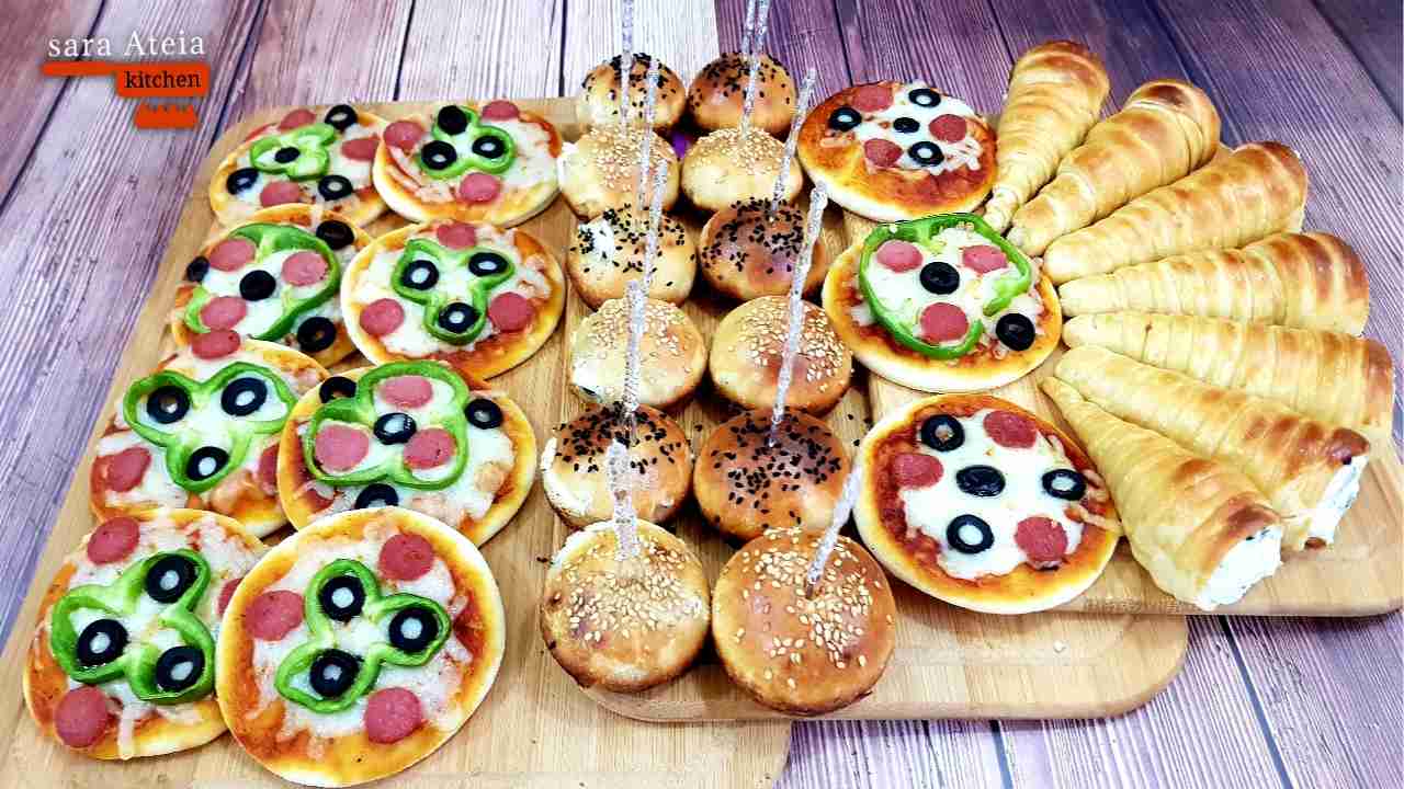 نضع الخميره ومعلقه من السكر فى نص كوب ماء دافئ ونقلبها جيدا ونتركها تتخمر نخلط المواد الجافه معا ثم نضيف لها المواد السائله والخميره ونعجنها جيدا حتى تكون العجينه ناعمه وبتلزق قليلا نتركها تخمر حتى يتضاعف حجمها ونبدأ فى تشكيل الفطاير فيديو الوصفه بالتفصيل على قناتى باليوتيوب مطبخ ساره عطيه sara Ateia kitchen