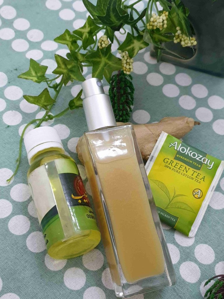 بالخلاط نضع منقوع الشاي الاخضر مع الزنجبيل وزيت شجرة الشاي ونخلطهم حتى يتجانسوا مع بعض وبعد ذلك نصفيها ونضعها داخل علبة بخاخ ونحفظها بالثلاجه ونستخدم مره يومياً عند تمشيط الشعر او بعد الشاور نرش منه على الشعر رائحته عطريه ومنعشه جربوها وادعولي