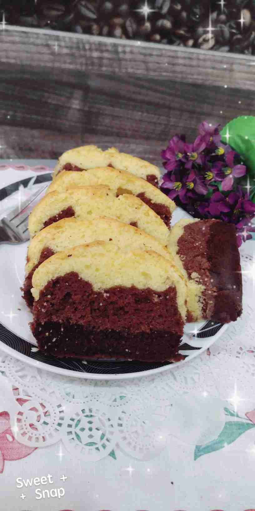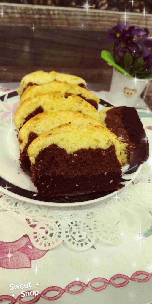 نحضر قالب الكيك الطولي و ندهنه بزيت و نرش دقيق و نسكب اول طبقه الخليط البني الداكن ثم بحذر شديد و بالملعقه نضيف فوقه الخليط البني الفاتح حتي تغطى الداكن تماما و اخيرا الخليط الابيض اللي بدون كاكاو نحطه بشويش حتي تتغطي الطبقه الثانية تماما، ،،، و ع الفرن و الف صحهـ