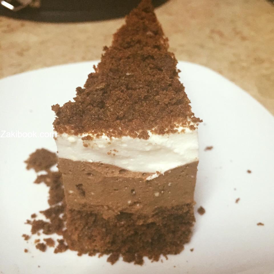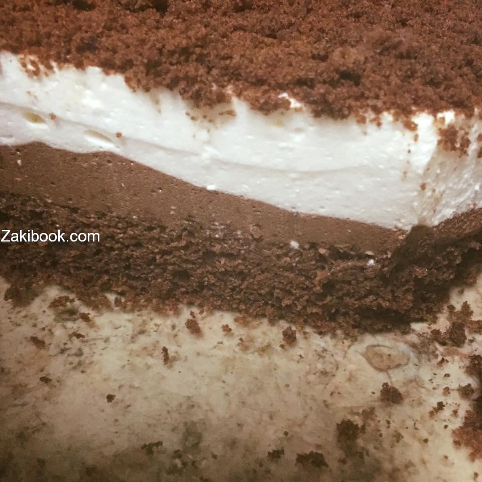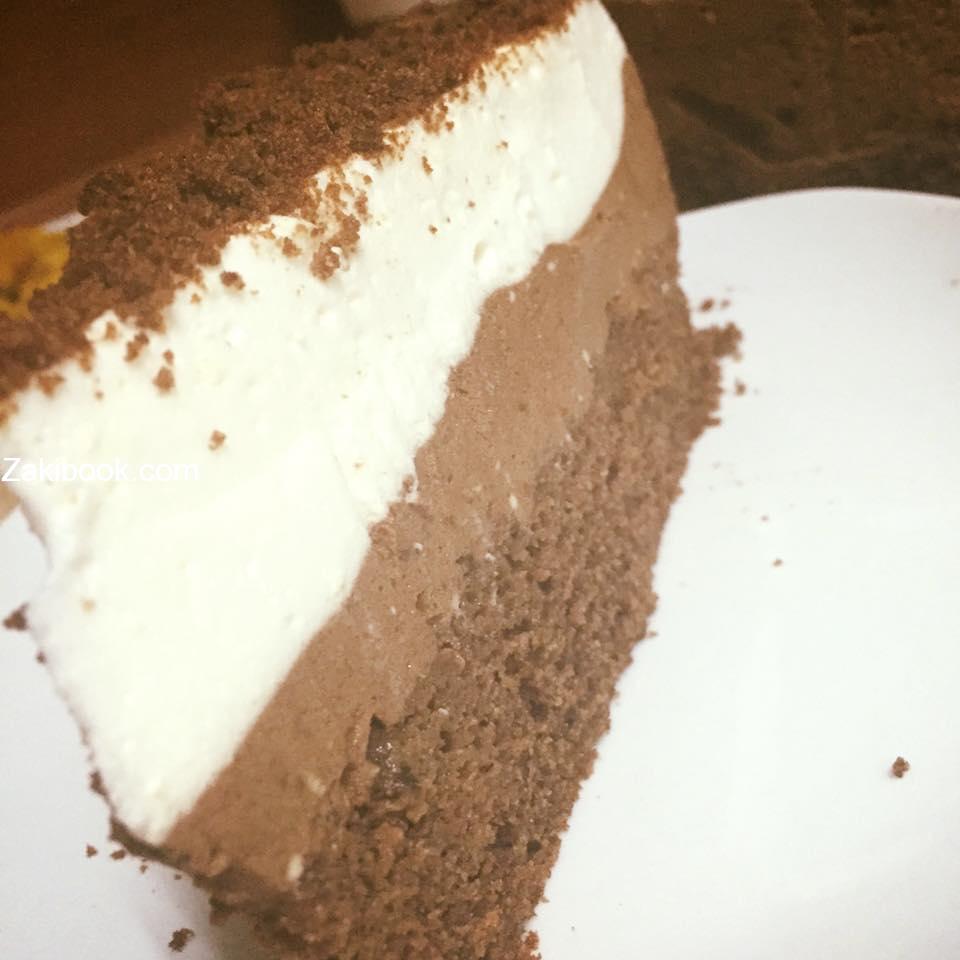 ثاني طبقه توضع طبقة موس الشوكلا بدخلها الثلاجه ١٠ دقائق وبعد هيك بندير الطبقه الاخيرة برفق وحنان حتى لا يمتزج الخليطين مع بعض واخر شي حطيت كيك زائد من عندي على وجه الموس الأبيض والف صحه