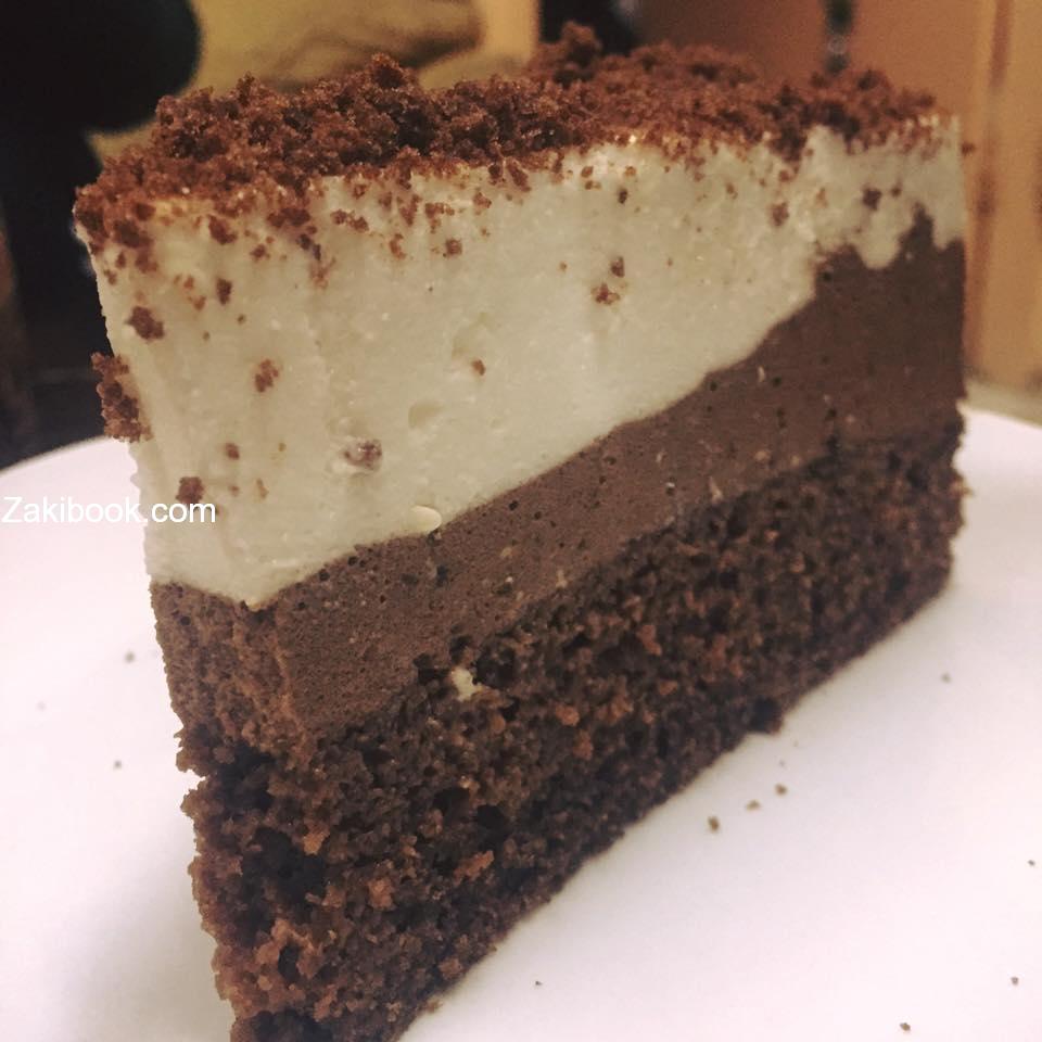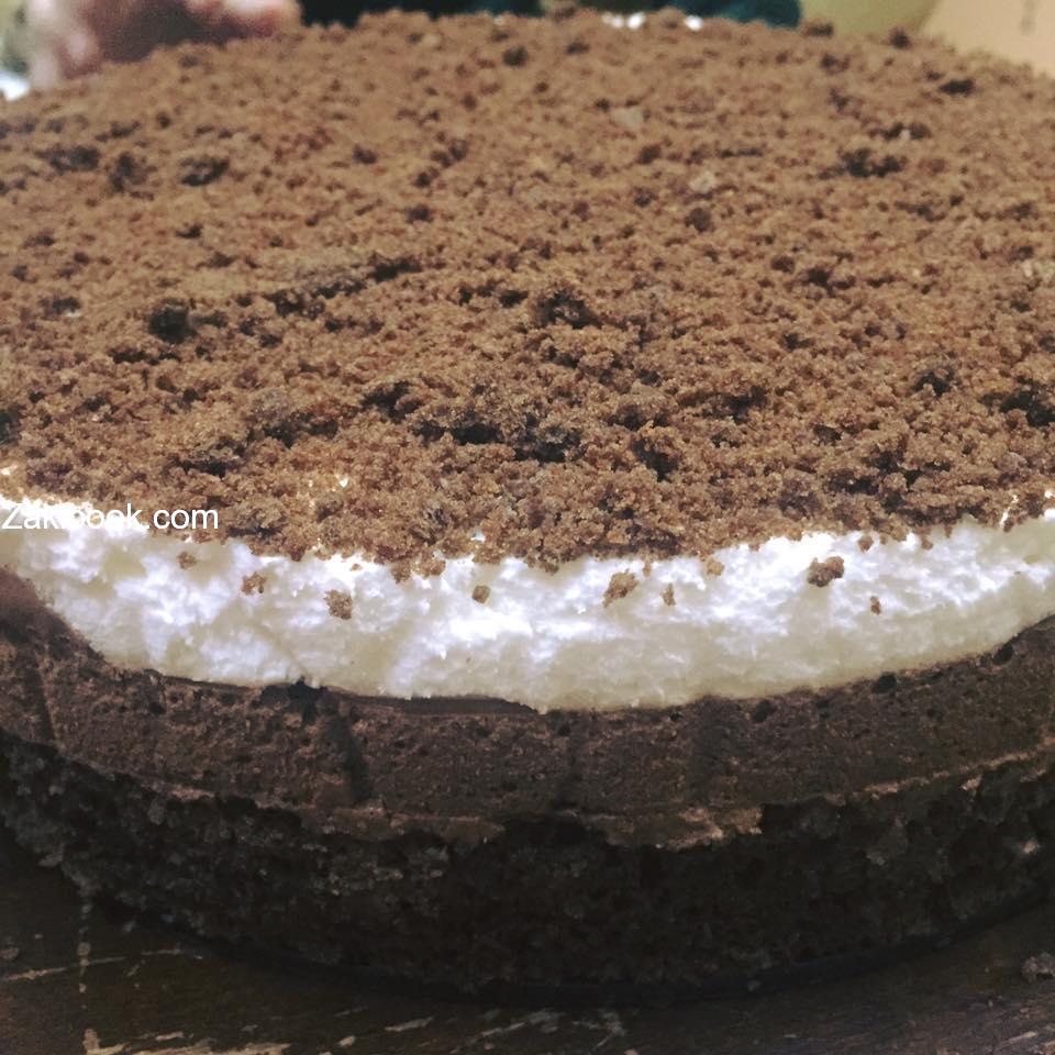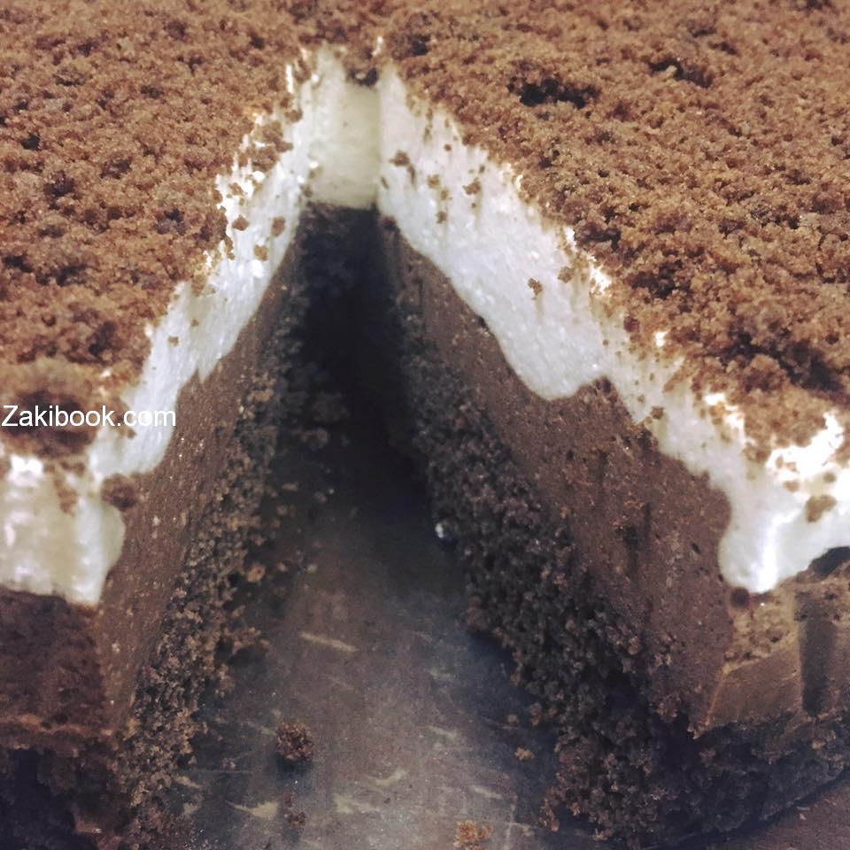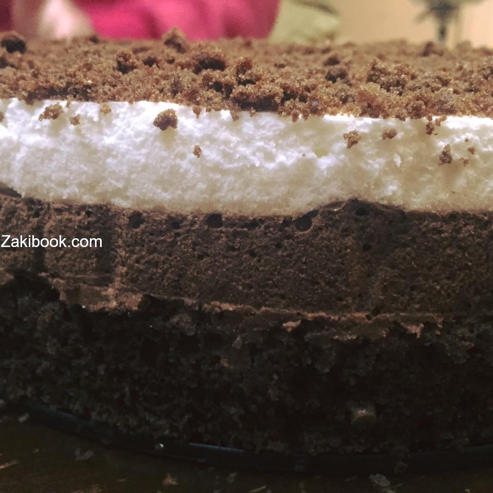 ثاني طبقه توضع طبقة موس الشوكلا بدخلها الثلاجه ١٠ دقائق وبعد هيك بندير الطبقه الاخيرة برفق وحنان حتى لا يمتزج الخليطين مع بعض واخر شي حطيت كيك زائد من عندي على وجه الموس الأبيض والف صحه