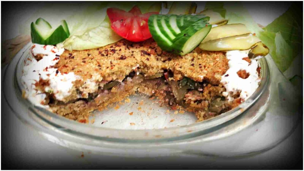 منحط ملعقة زيت بالجاط ومنفرد طبقة من عجينة الفلافل من تحت وعالجوانب بعدين منخلط مكونات الحشوة ومنحشي فيها