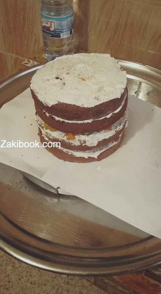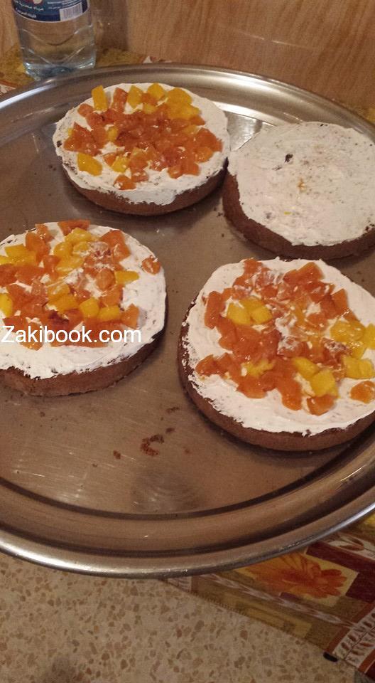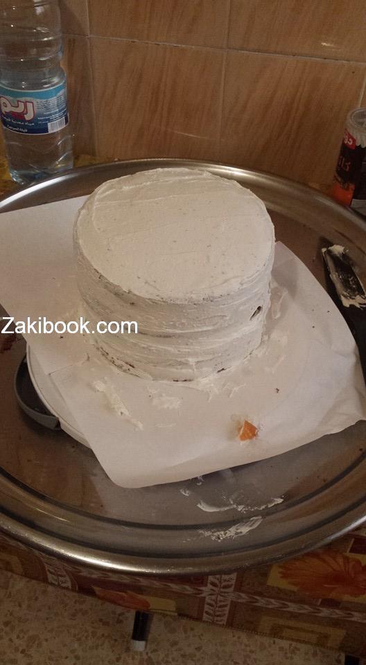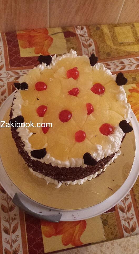 الحشوة: كريم خفق و سلطة فواكه القطر الموجود في علبة سلطة الفواكه لتسقية الكيك او قطر منرش شوي عالوجه الي حيكون للداخل و منخلط لكريما بسلطة الفواكه تقليبة سريعة و منسكر لكيك ثم منغلفو بكريما الخفق و منزينو حسب لزوق