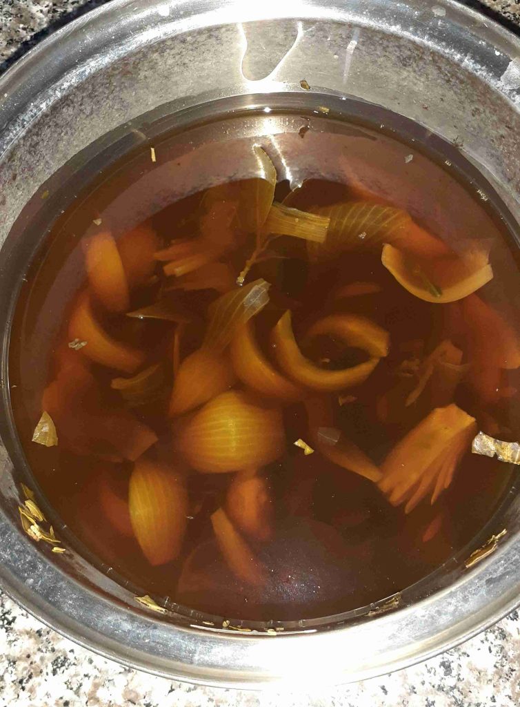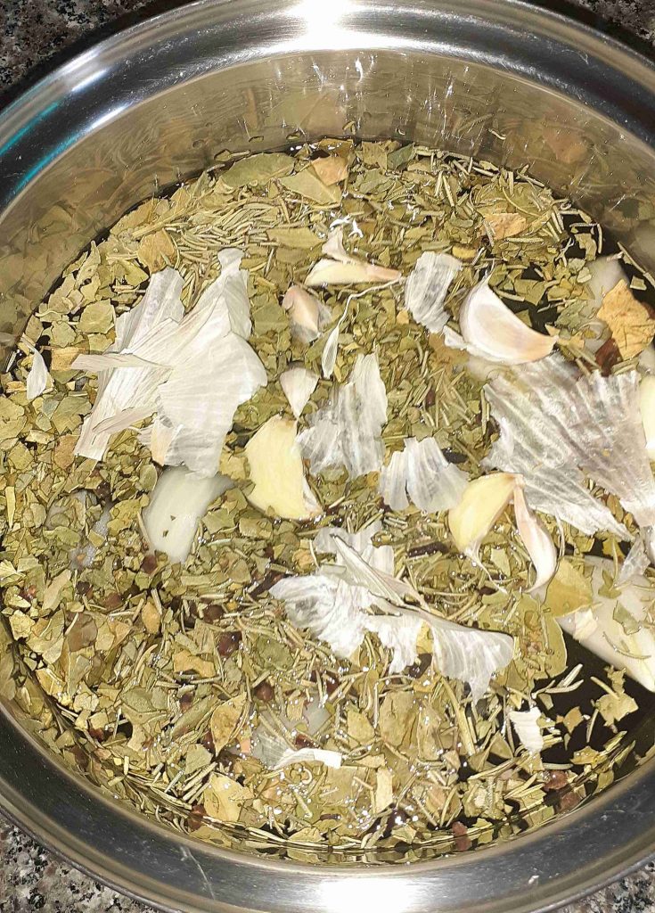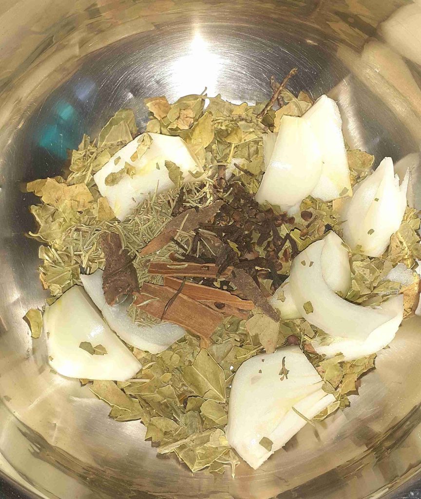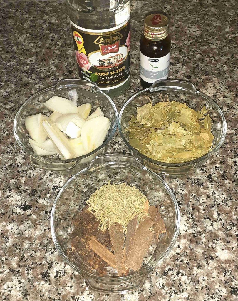 نضع البصل والثوم واوراق السدر واكليل الجبل وعيدان القرفة في طنجرة ونضيف الماء ونغطي الطنجرة ونضعها عالغاز لحد ماتغلي نوطي النار ونتركها تغلي لمدة ثلث ساعة.