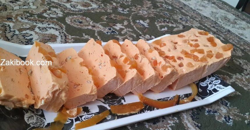ثم يبطن قالب الكيك المستطيل بكيس نايلون, يوضع من تحت مشمش مجفف ومقطع ويسكب الخليط.