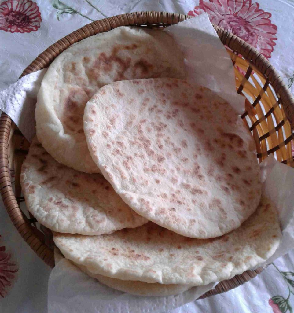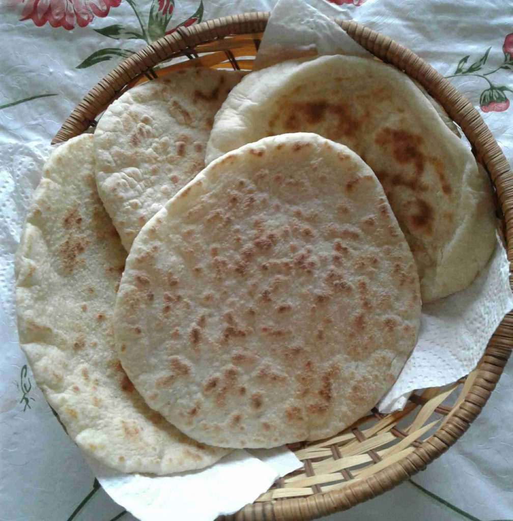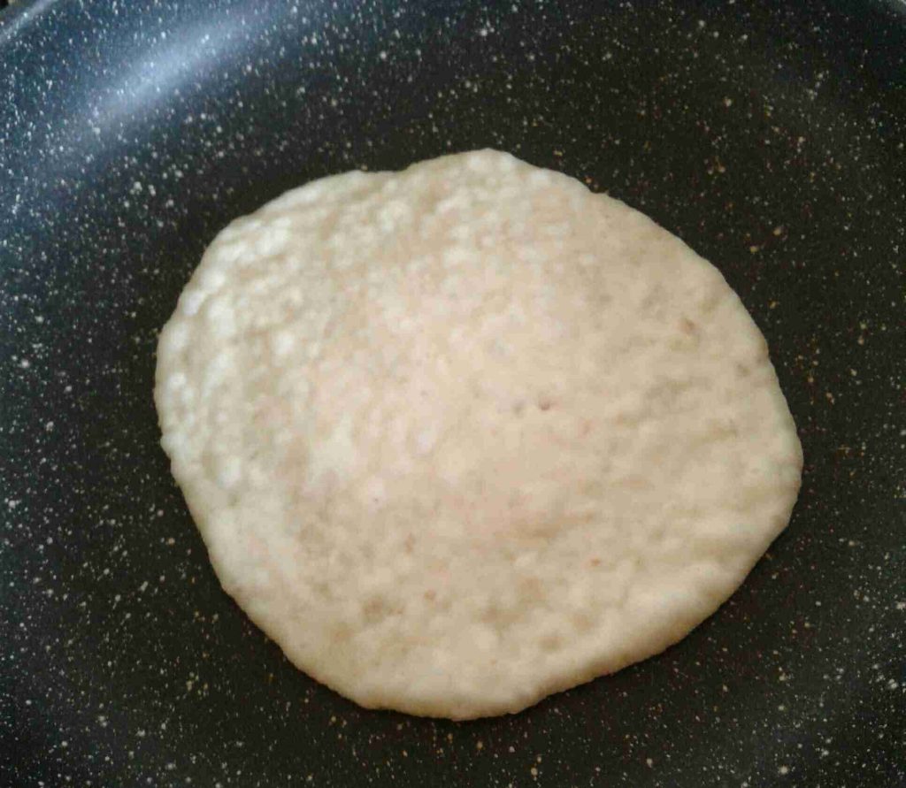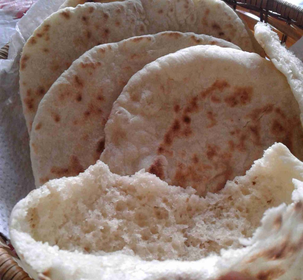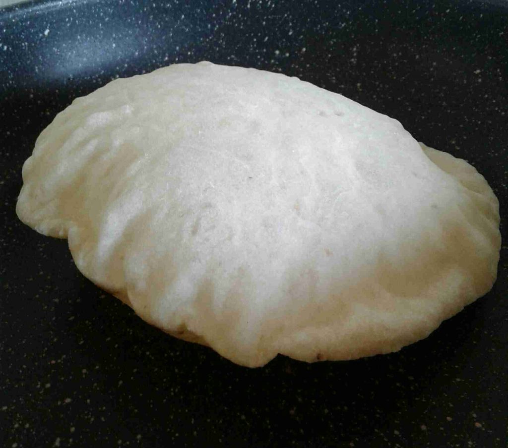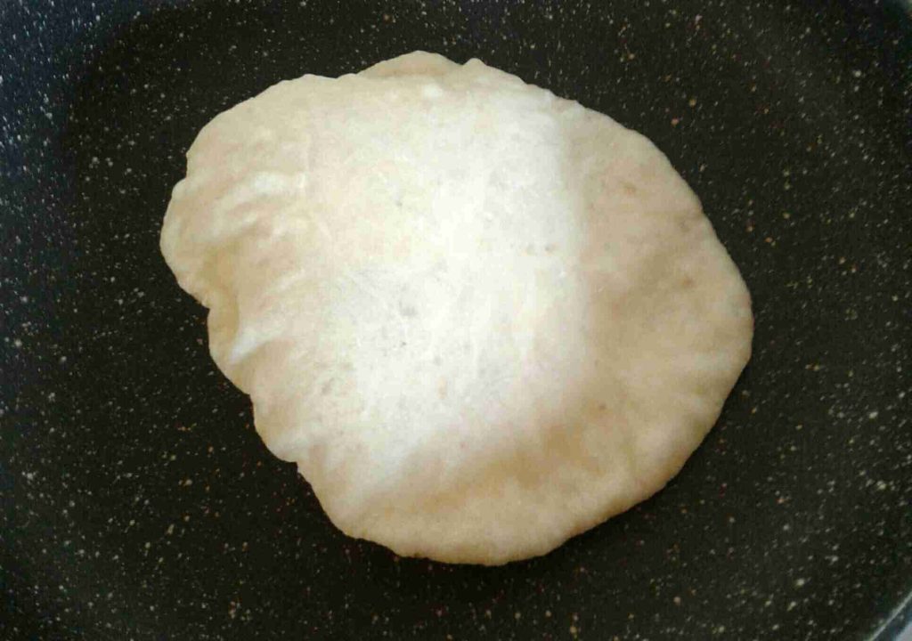 – نسخن مقلاة على نار عالية ونضع فيها الرغيف ، وعندما يبدأ بالإنتفاخ نخفض النار إلى الوسط وننتظر حتى ينتفخ بشكل كامل ، ثم نقلبه على الجهة الأخرى ونراقبه حتى يتحمر ، ثم نرفعه ونغطيه.