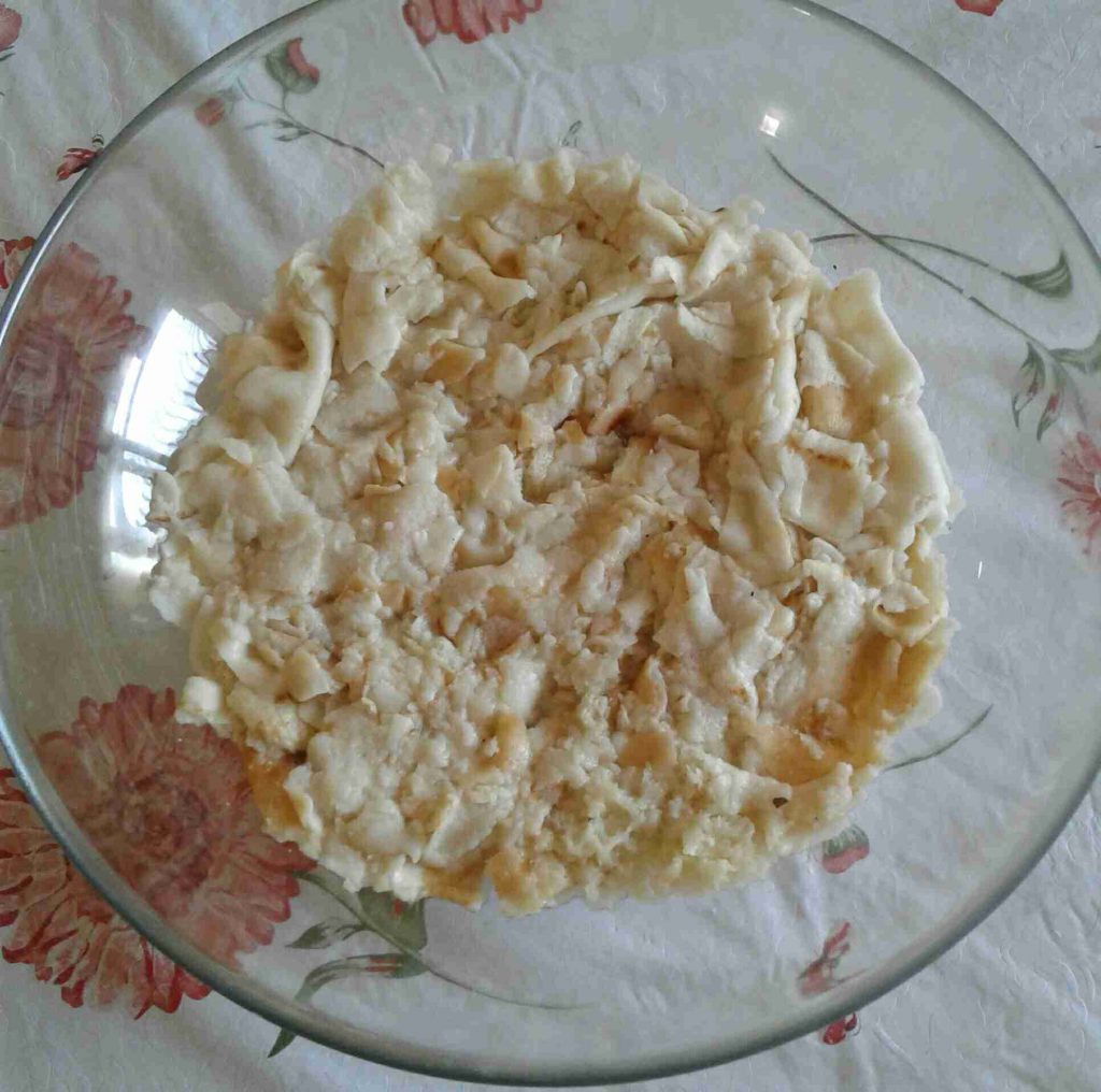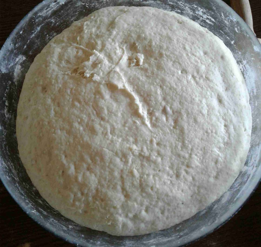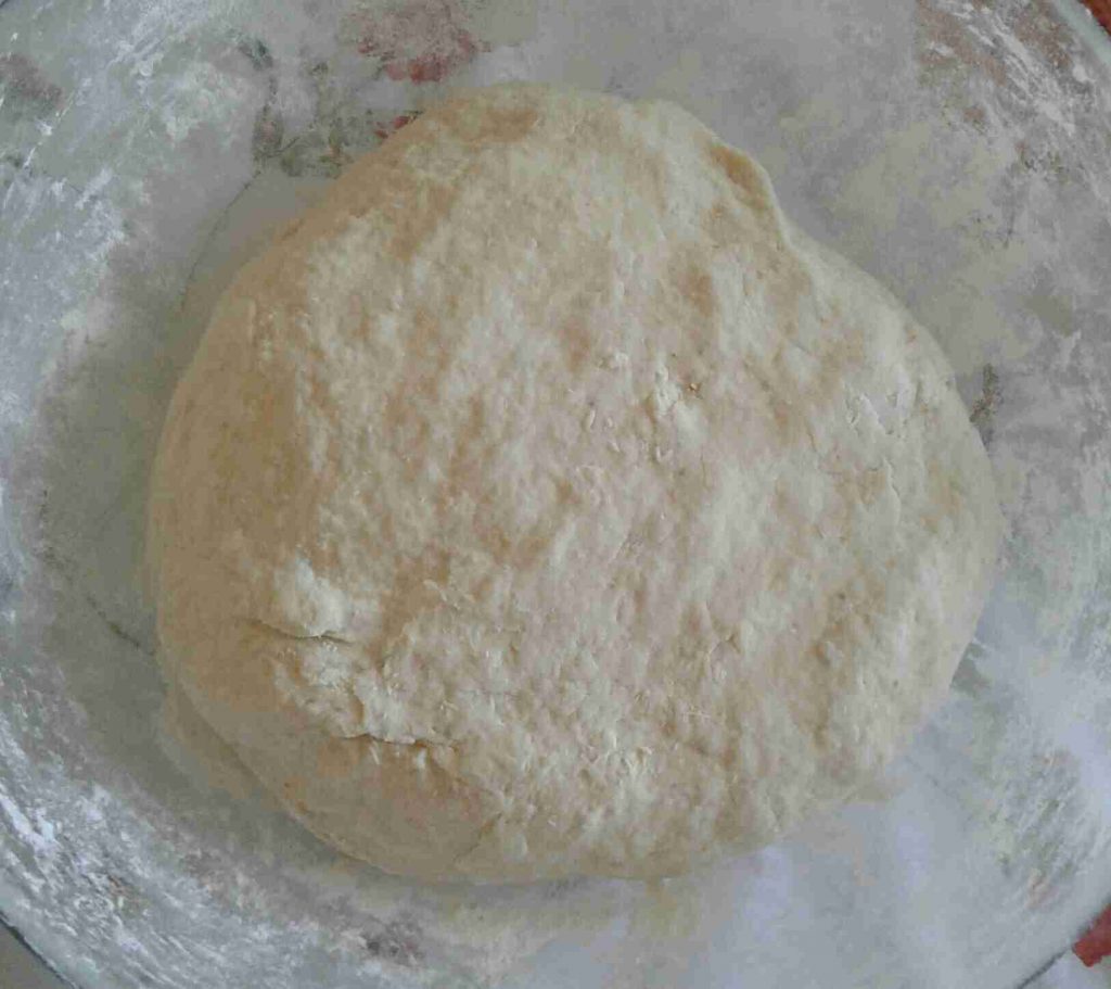 – في وعاء: نكسر الخبز لقطع صغيرة ونغمرها بالماء الساخن ونهرسها جيدا، وعندما تصبح حرارته دافئة نضيف الخميرة والسكر ونعجن جيدا ، ثم نضيف القليل من الزيت ورشة الملح ونضيف الطحين تدريجيا حتى تتماسك العجينة ، ونغطيها ونتركها تختمر.
