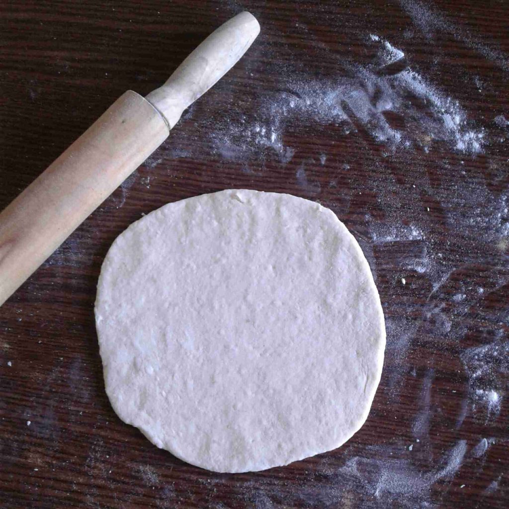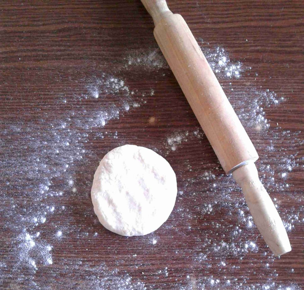 – نبدأ بفرد أول كرة ونرش رشة طحين على مكان العمل ونرق العجينة ونفردها على شكل رغيف.