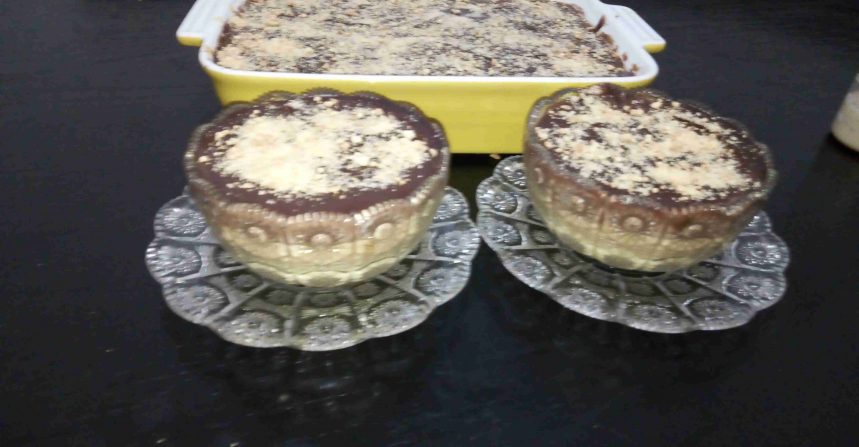اول طبقه بنخلط الحليب والكاستر والسكر مع الماء ع الغاز ليتقل قوامه بنسكبه بالزبادي او البايركس وبعد بنصف البسكويت ع الطبقه الأولى الطبقه التانيه بنكرر مقادير الحليب والسكر والكاستر وبنضيف معلقتين النسكافيه وبنحطه ع الغاز ليتقل قوامه بنسكبه فوق الطبقه الأولى وبنرجع بنصف بسكوت فوق الطبقه التانيه وبنرجع بنكرر المقادير الحليب والسكر والكاستر وبنضيف الكاكو وع الغاز وهيك بتكون هاي الطبقة التالته وزينتها ببسكوت مطحون وصحتين وعافيه