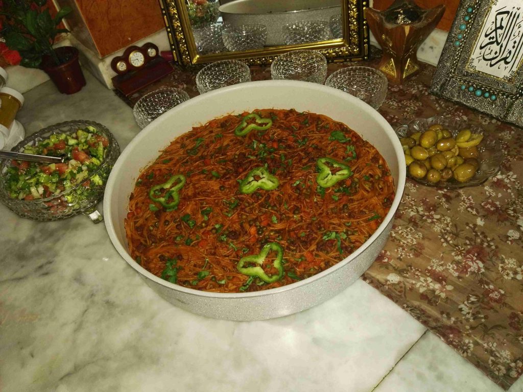 بنكون على الغاز حاطين زيت والبصل واللحمة والبهارات والفلفل والملح بنشوحها لحتى تستوي اللحمة بعدين بنحط البازيلا والجزر والذرة والفليفلة المقطعة صغير وبنخليهم لحتى يستوو ….. بنضيف صلصلة البندورة و بتشوحها معهم شوي حتى توخذ طعم قبل ما نضيف المي