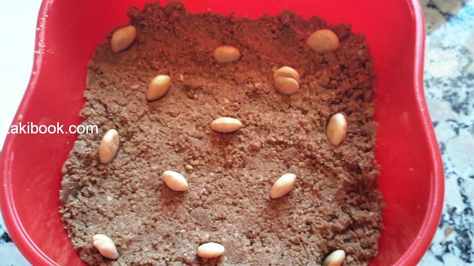 125غ لوز مسلوق و محمر او مقلي و مطحون قليلا مع ترك قليل من اللوز للتزيين 125غ من السمسم مغسول و محمص و مطحون مع ترك القليل مقدار 2 ملعقة كاملا