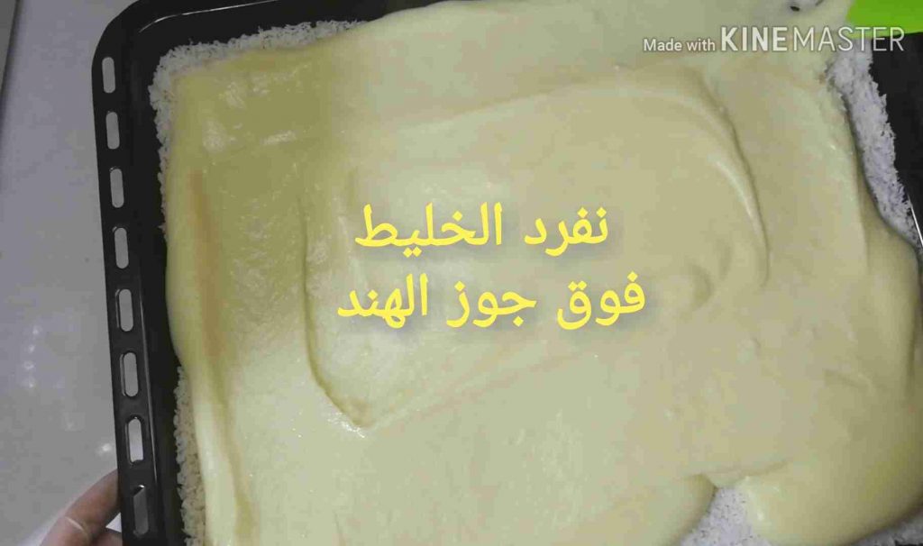 بنكون مجهزين صينية مستطيلة وحاطين فيها كمية كبيرة من جوز الهند عشان ما يلزق الخليط.