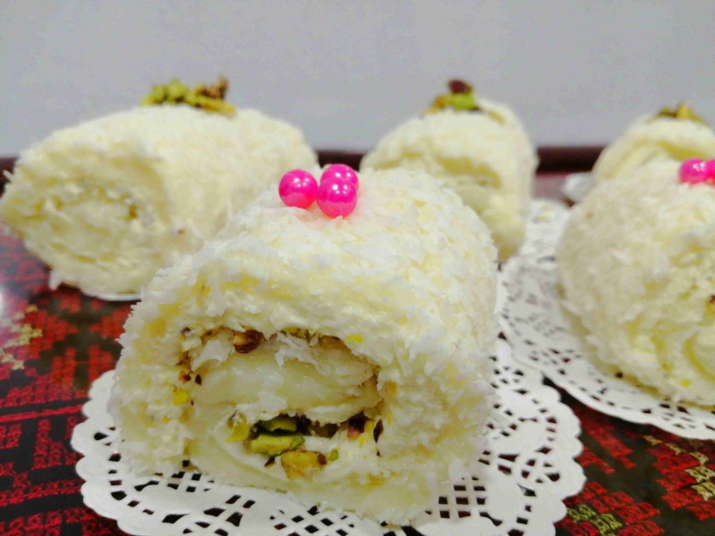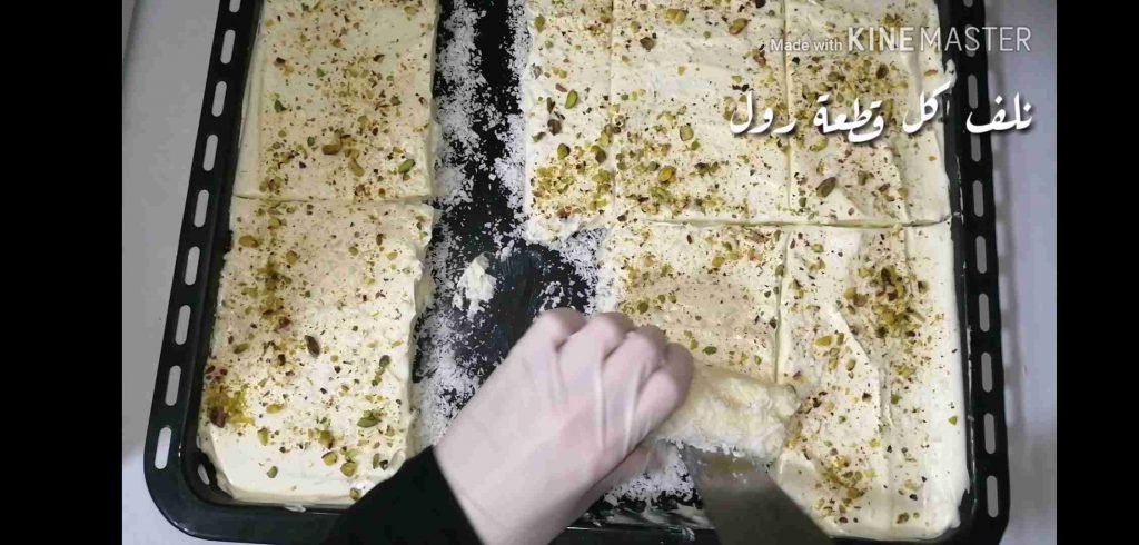 بعد مايبرد بنقسم الحلو بالسكينة بالحجم اللي بنحبه اقسام طولية مستطيلات وبنصير نلف كل قطعة بلطف وهيه رح تنلف معك بسهولة وبندحرجها بجوز الهند.