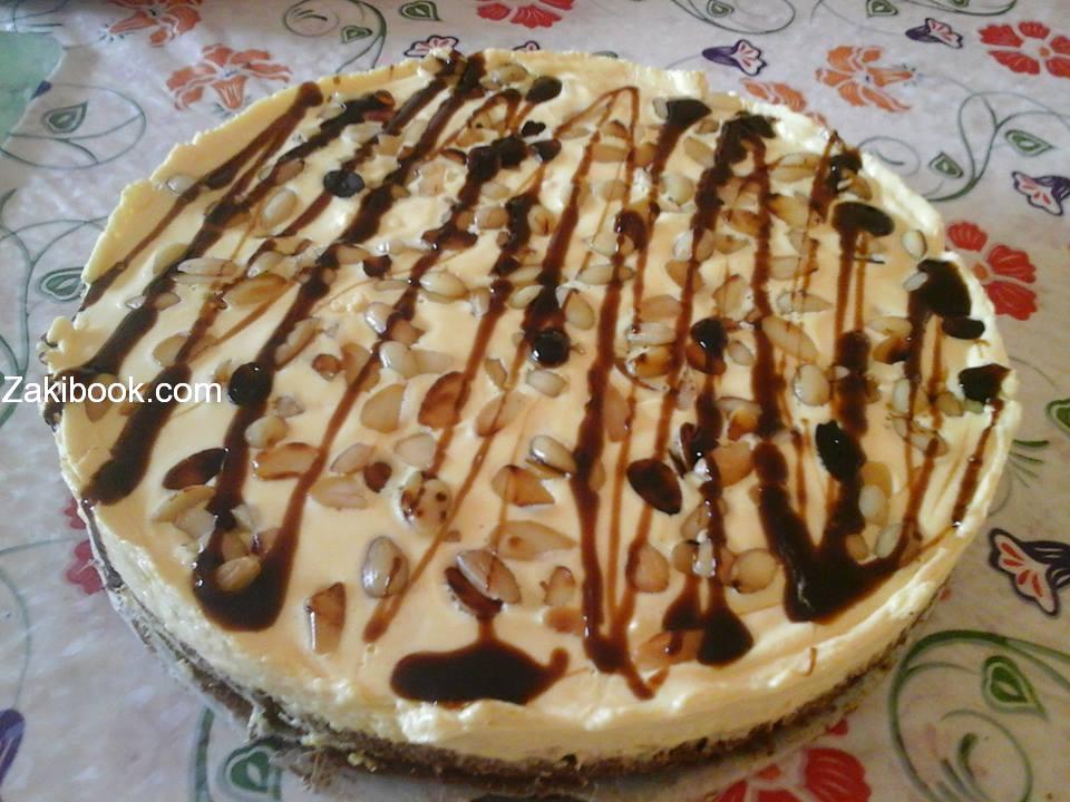 تتكون من اربع قطع من جبنة كيري مع باكيت من كريم كراميل مع بباكيت من كريم شانتي او دريم ويب مع ملعقتين من حليب مكثف مع نص كاس من ماء البارد وتخلط بخلاط جيدا ثم تصب على الطبقة الاولى وتوضع في الثلاجة على اقل اربع او خمس ساعات.