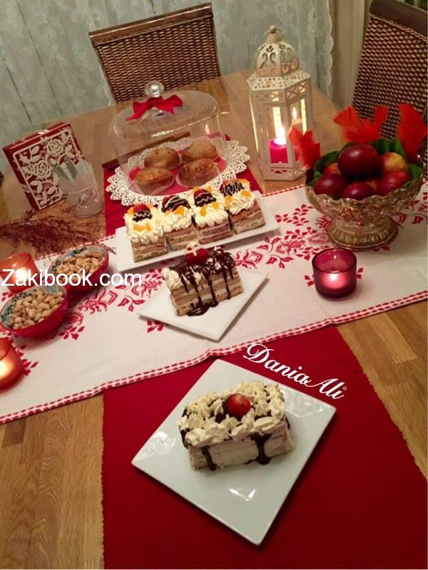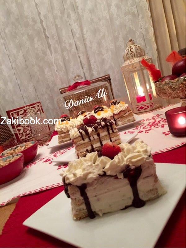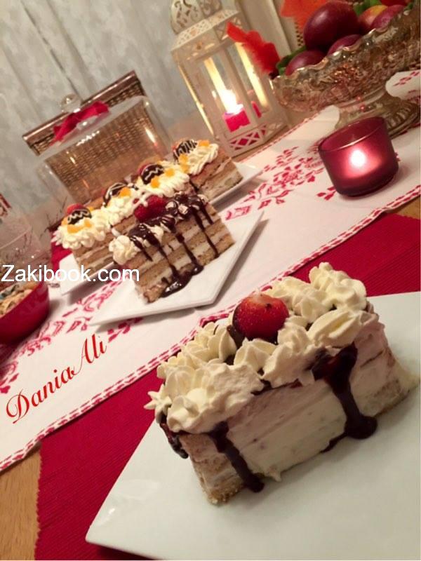٤- طريقة العمل ناخذ اول طبقة من الكيك وندهنها بالمربى وكريمة الخفق او كريم شانتي ثم نضع الطبقة الثانية ونكرر التزين والثالثة وهكذا ثم نزينها بالكريمة ونضعها بالثلاجة لتبرد لمدة ساعة من ثم نقطعها بحذر الى مستطيلات متساوية ثم نزينها بصلصة الشوكولاته اوالفواكه حسب الرغبة وتقدم باردة والف عافية صحة وهنااااا تحياتي