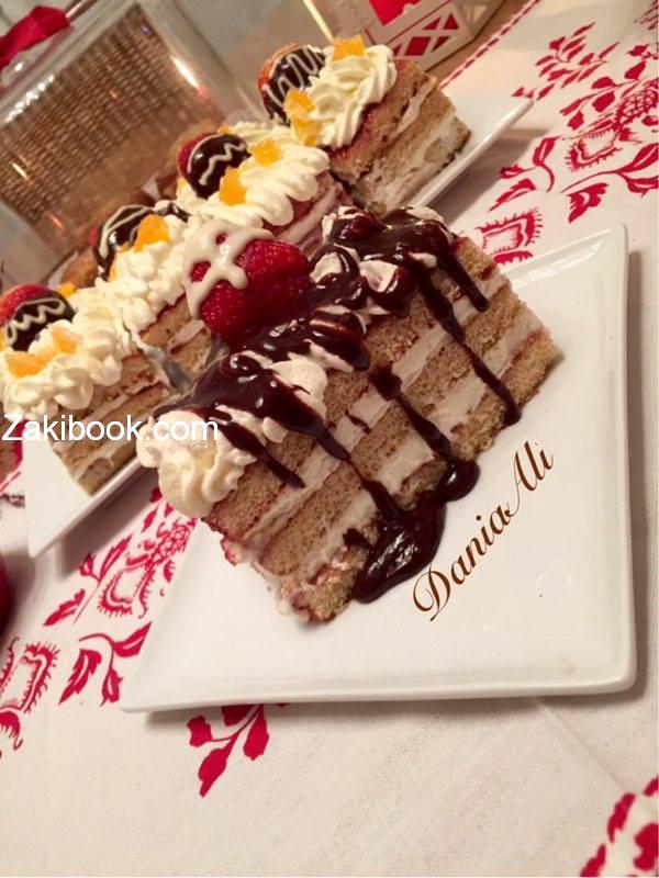 قطع الكيك الإسفنجية بالكريمة وصلصة الشوكولا على طريقة الشيف دانيا العلي, لنتابع معها الطريقة.