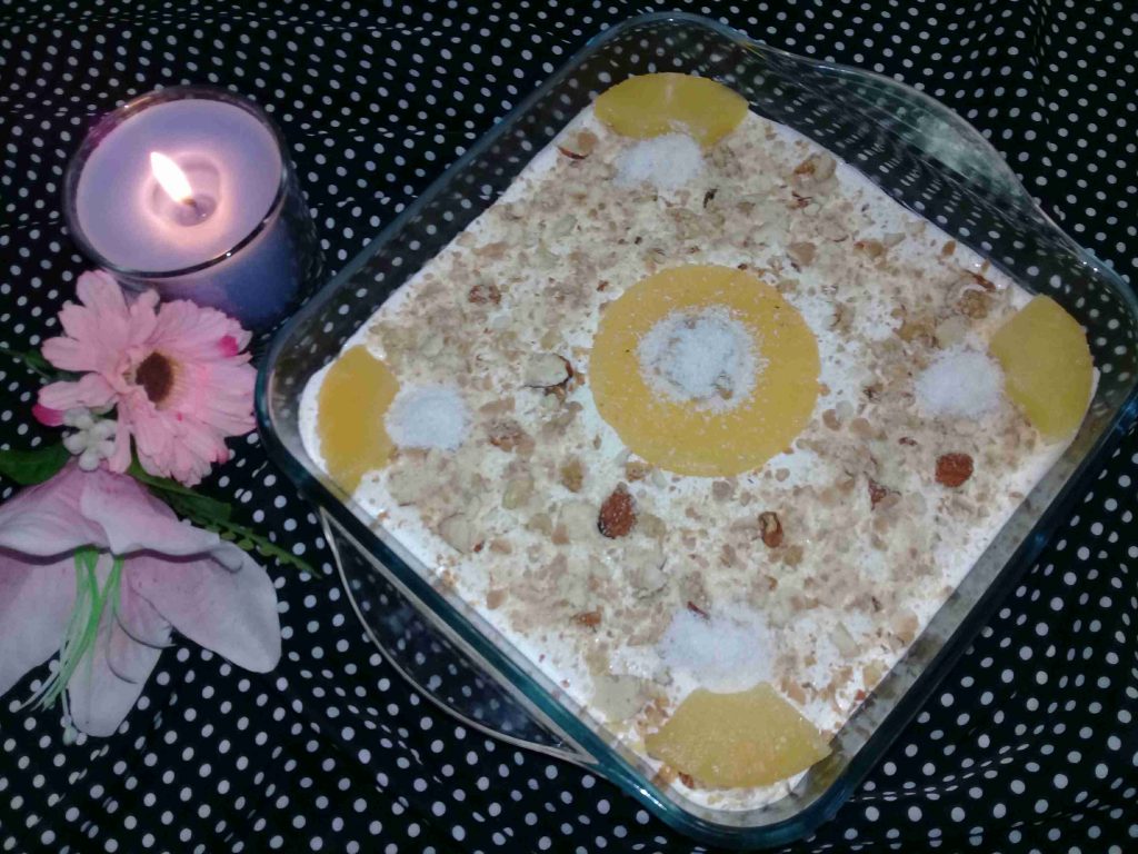 زينتها بالمكسرات و البسكوت الناعم و الجوز هند و قطع من الأناناس حطيتها بالثلاجة لمده ساعتين و بعدها هجموا عليها و الحمد لله قدرت أصورها ههههه ما لحقت أصورها و هيا مقطعه