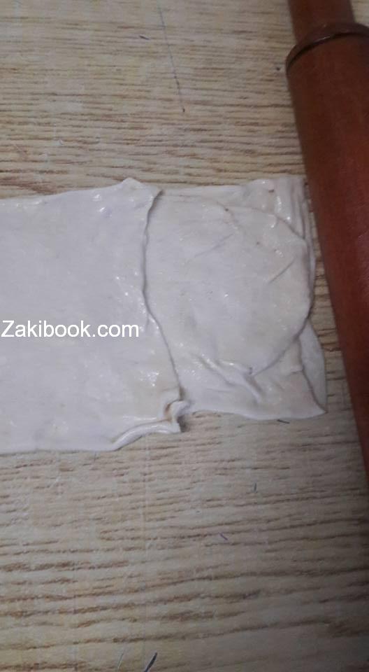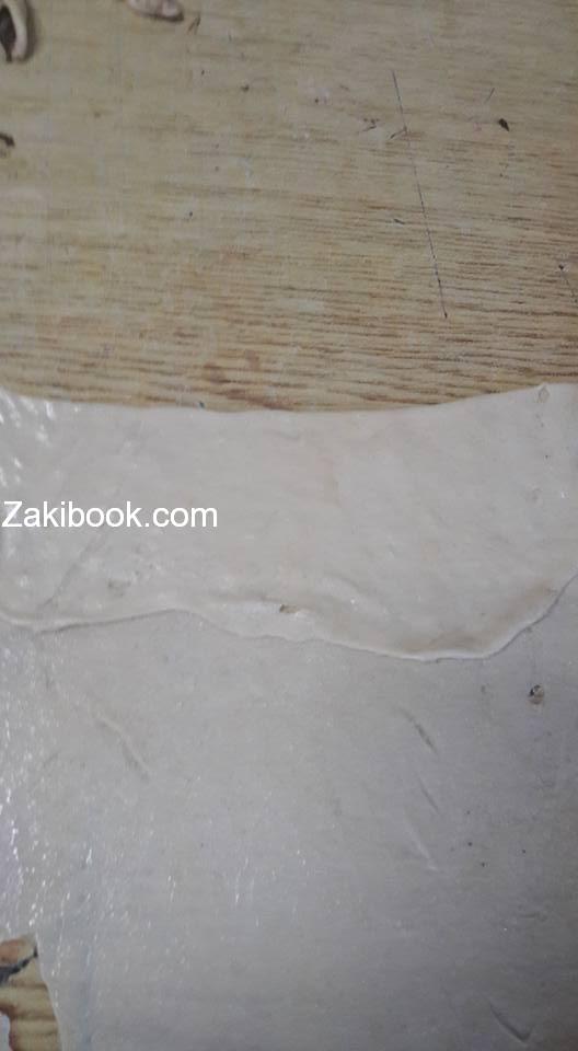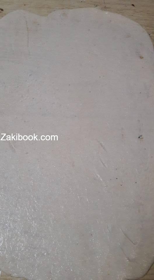 نضع باطراف الاصابع زيت نباتي ونرققها جيدا ثم ندهنها سمنة ونرش السكر عليها ونطبقها كما موضح بالصور عند اثناء تطبيقها نضع الزبدة في كل طبقة