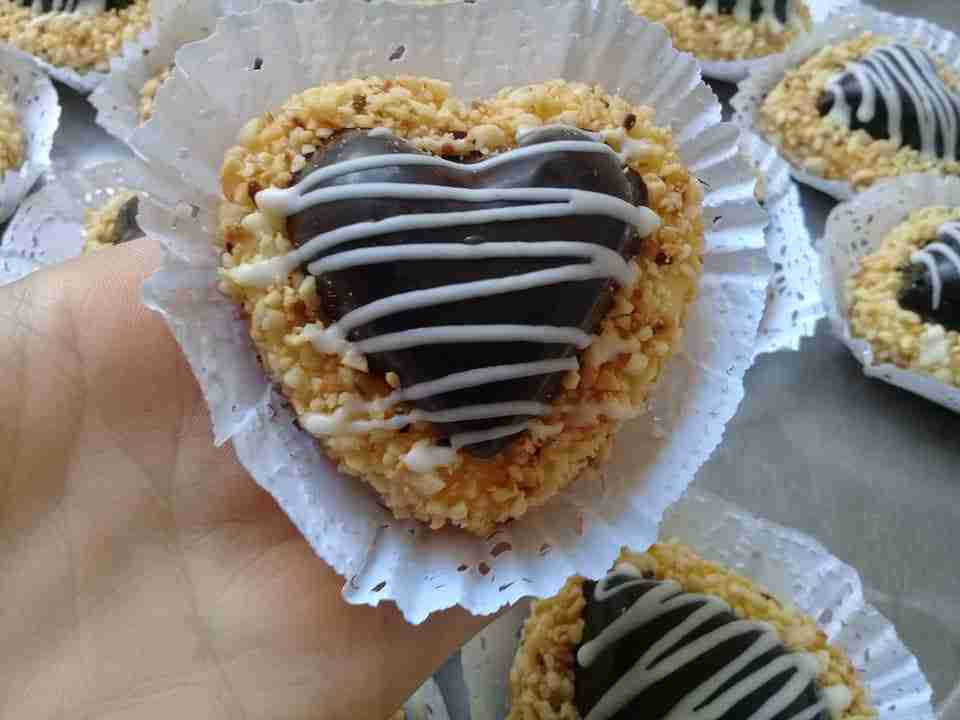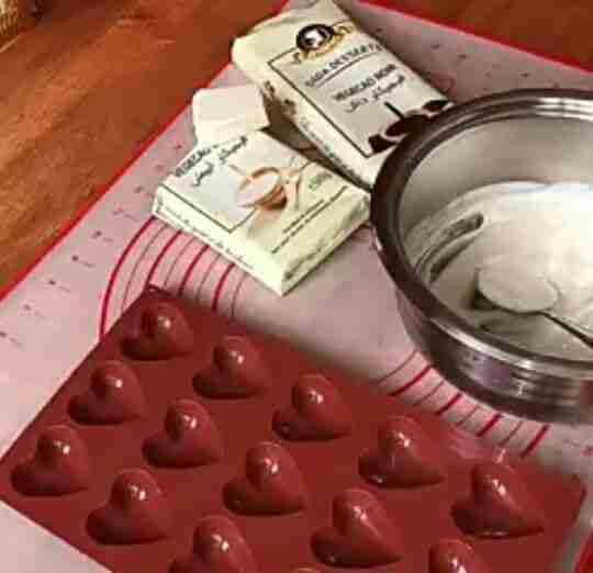 تحضير قلوب الشكولاته في اشكال كتيرة انا خترت هاد مثل ماشايفين بصورة ادبت شكولاته بحمام مائي بدون اضافة ولا شي ودهنت القالب ثم دخلته ثلاجة ثم حشيت القوالب بي كريمة كرامال والفول سوداني