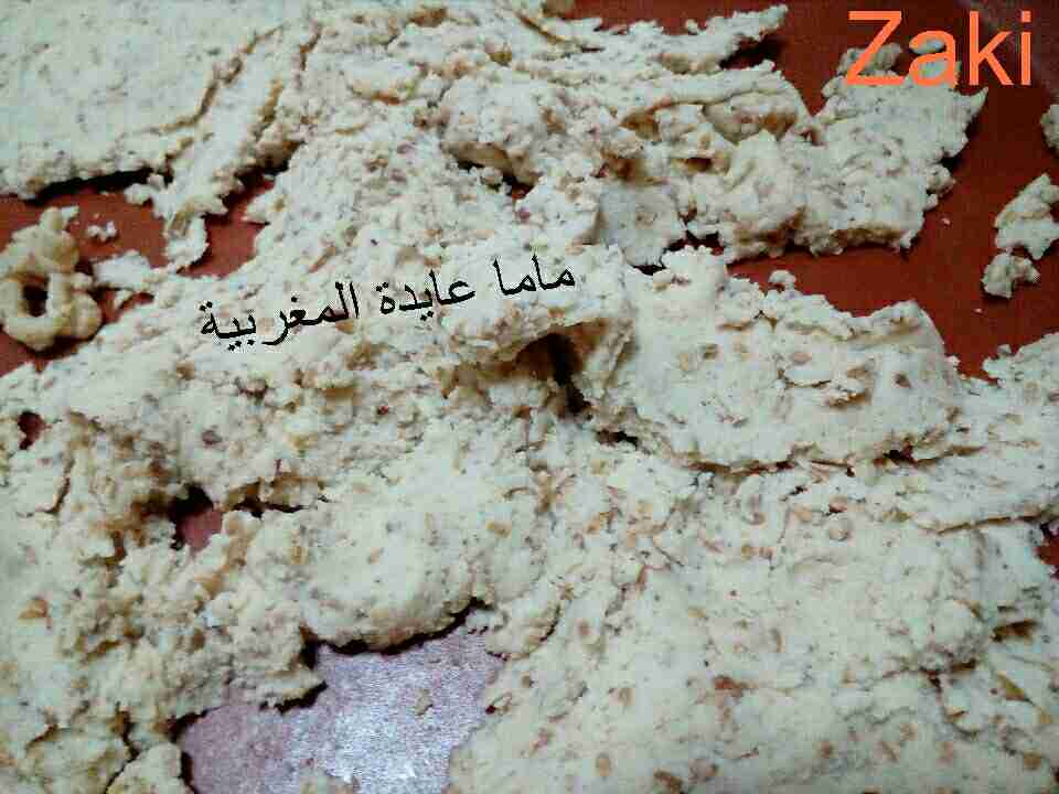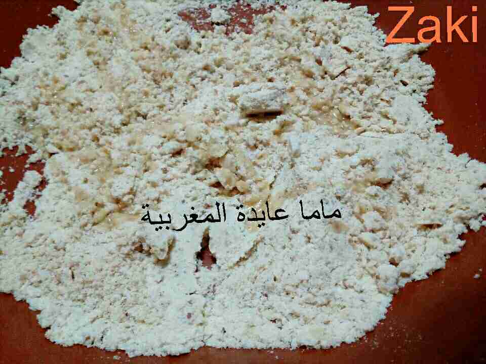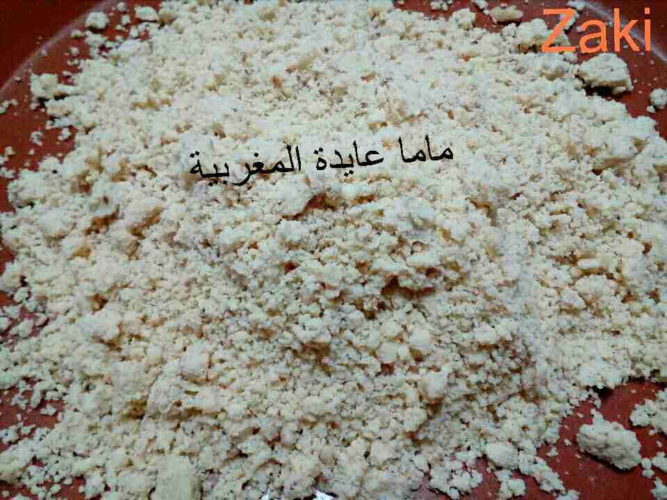 في اناء نخلط الدقيق المغربل،و السكر المغربل و اللوز المطحون و السمسم، و القرفة و خميرة الحلويات نخلط لتتمزح المكونات الجافة.