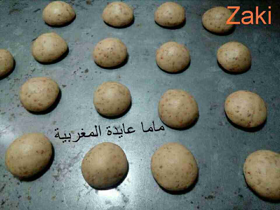 نشكل كرات بالحجم الموضح في الصورة رقم 5 و نصففهم في صفيحة الفرن (تقريبا نحصل في هذه الكمية على 36 قطعة) .