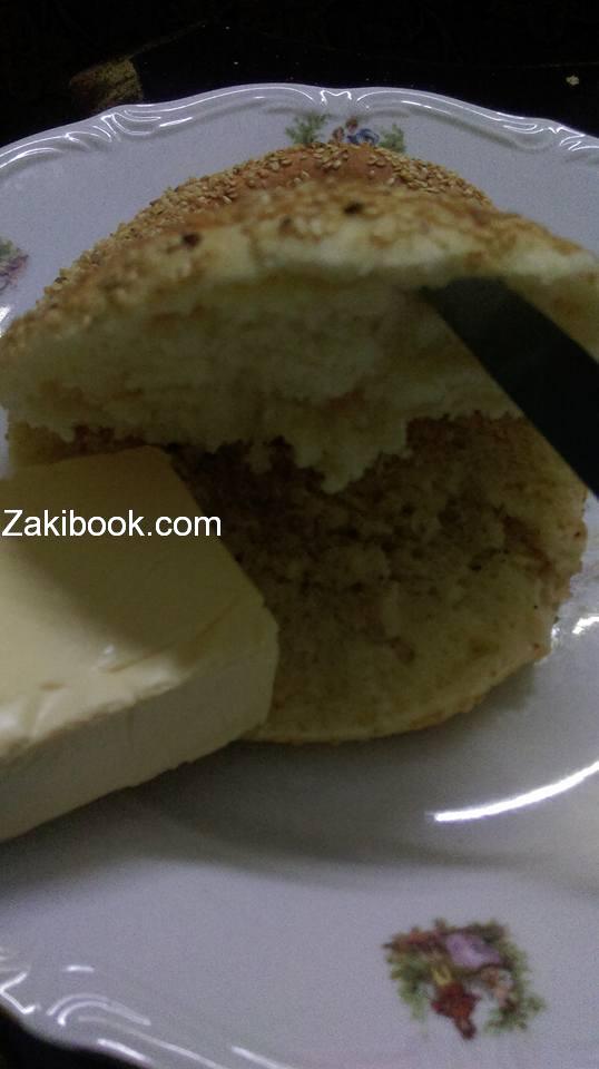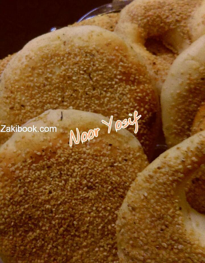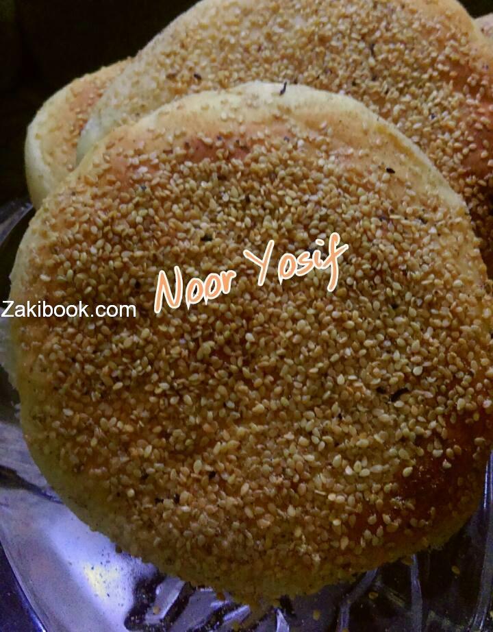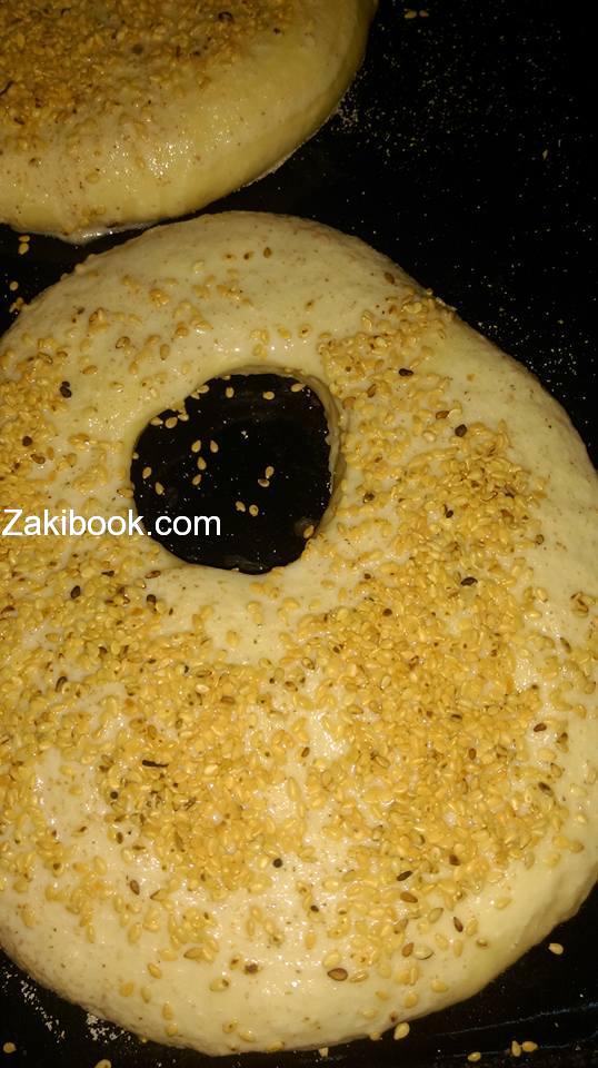 نشغل الفرن على حرارة مرتفعة وندهن الكعك بالتغطية ونرش صواني الفرن بالنخالة ونضع الكعك فيها مع رشها بالسمسم الوفير