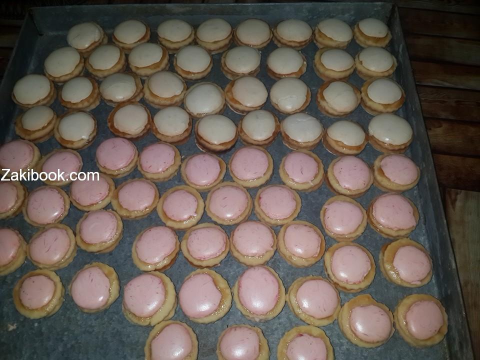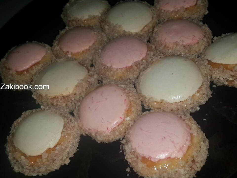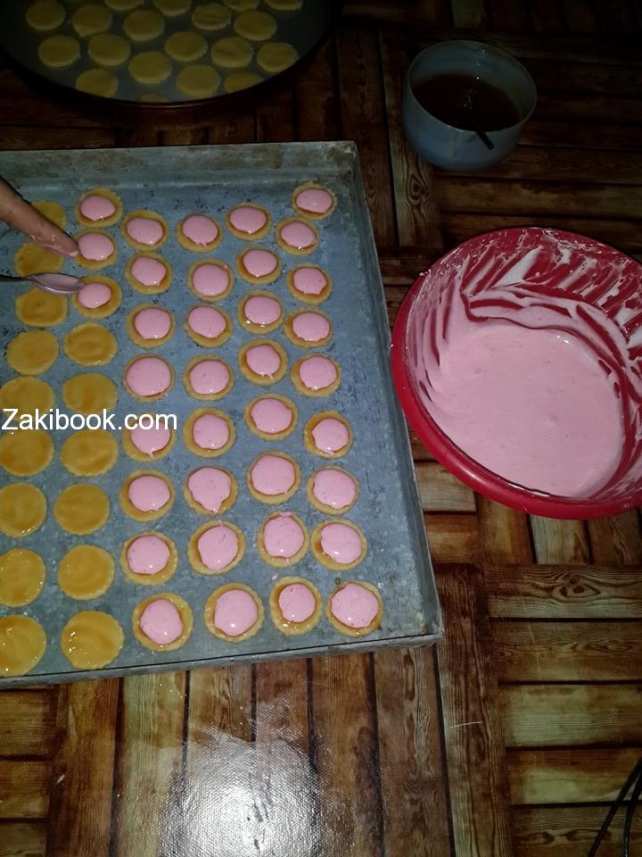 ثم نحضر الميرانغ الذي هو عبارة عن بياض البيض مخفوق مع بودرة السكر الناعم حتى تحصلين على كريما سائلة ، وممكن أن نضيف لها قليل من الملون حسب الرغبة ، ونزين فوق كل دائرة بالميرانغ ، مثل ما هو موضح في الصورة .