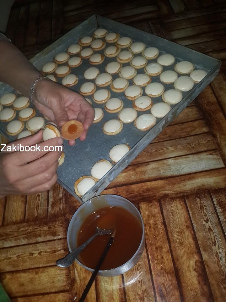 بعد ذلك ندهن كل دائرة بمربى المشمش كما هو موضح في الصورة