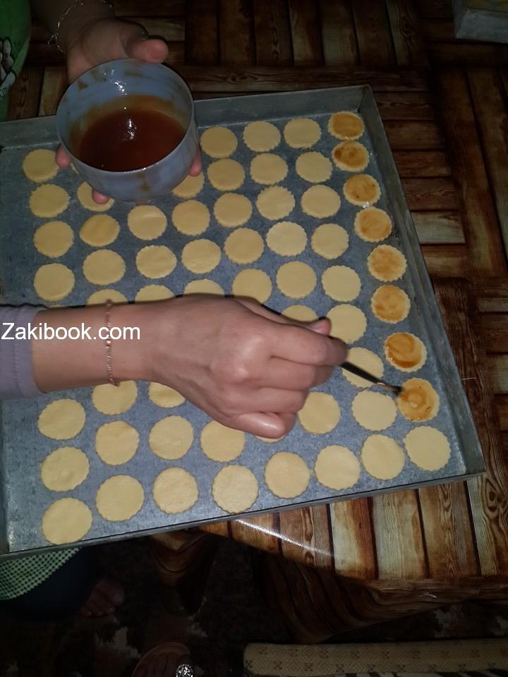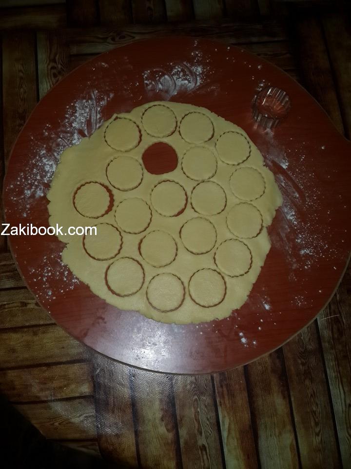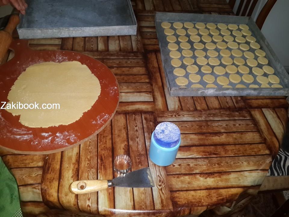 تكور العجينة وتفرد بالشوبك ، ثم تقطع بقطاعة الحلوى ، على شكل دوائر صغيرة كما هو موضح في الصورة