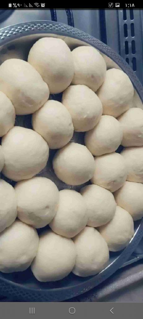 ألم العجينة بيدي بعد ما أختمرت وأبدأ بعملها كرات متوسطة الحجم…