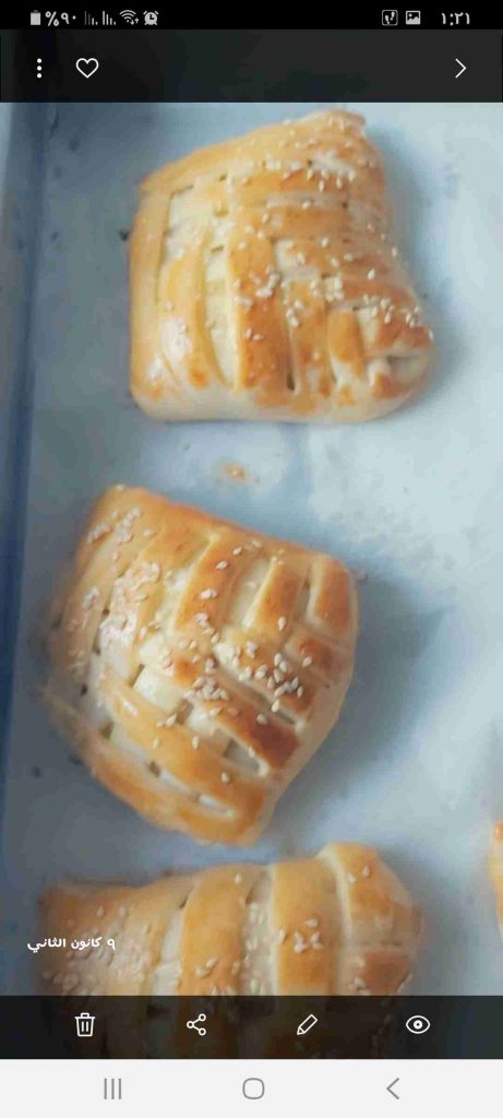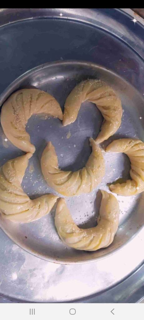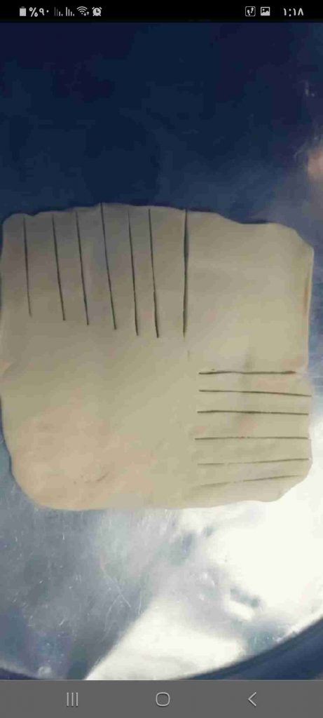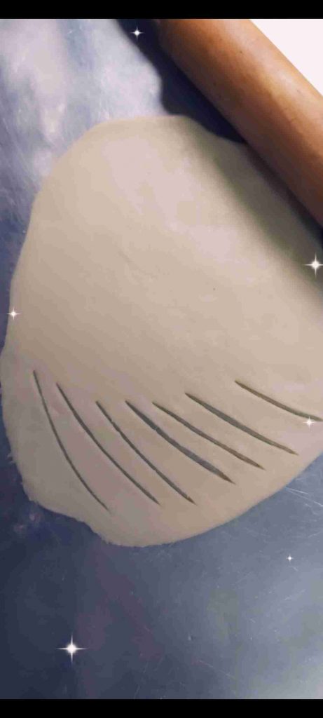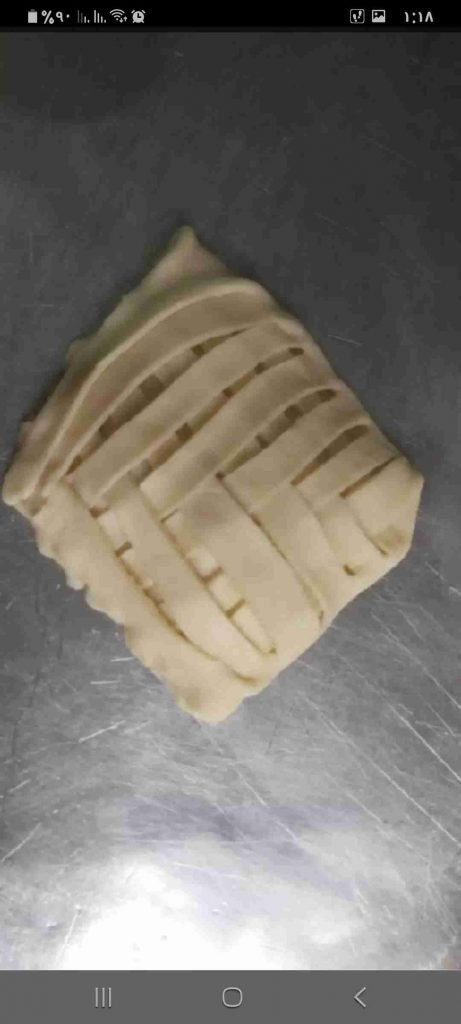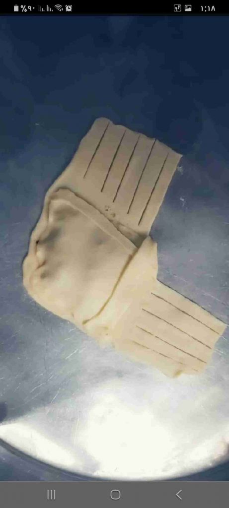 أبدأ بعمل الشكل المرغوب للفطائر…هنا وضحت ٣ اشكال سهلة و جميلة لتشكيل الفطائر ان شاء الله تتوضح بالصور هي شكل الحصيرة والهلال والمبرومة….
